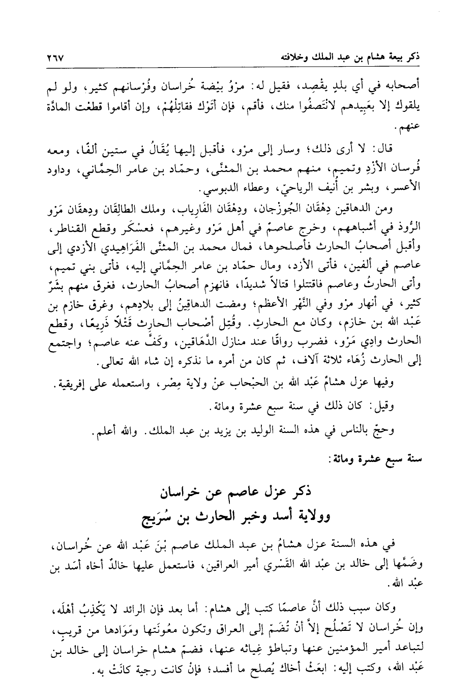 ومن الدهاقين دهقان الجوزجان ، ودهقان الفارياب ، وملك الطالقان ودهقان مرو الروذ في اشباههم ، وخرج عاصمٌ في أهل مرو وغيرهم ، فعسكر وقطع القناطر ، وأقبل أصحاب الحارث فأصلحوها ، فمال محمد بن المثنى الفراهيدي الأزدي إلى عاصم في ألفين ، فأتى الأزد ، ومال حماد بن عامر الحماني إليه ، فأتى بني تميم ، وأتى الحارث وعاصم فاقتتلوا قتالا شديداً ، فانهزم أصحاب الحارث ، فغرق منهم بشرٌ كثير ، في أنهار مرو وفي النهر الأعظم ؛ ومضت الدهاقين إلى بلادهم ، وغرق خازم بن عبد الله بن خازم ، وكان مع الحارث . وقتل أصحاب الحارث قتلاً ذريعاً ، وقطع الحارث وادي مرو ، فضرب رواقاً عند منازل الدهاقين ، وكف عنه عاصم ؛ واجتمع إلى الحارث زهاء ثلاثة آلاف ، ثم كان من أمره ما نذكره إن شاء الله تعالى . وفيها عزل هشامٌ عبد الله بن الحبحاب عن ولاية مصر ، واستعمله على إفريقية .