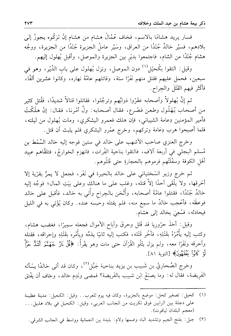 وقيل : التقوا بكحيل دون الموصل ، ونزل بهلول على باب الدير ، وهو في سبعين ، فحمل عليهم فقتل منهم نفراً ستة ، وقاتلهم عامة نهاره ، وكانوا عشرين ألفا ، فأكثر فيهم القتل والجراح .