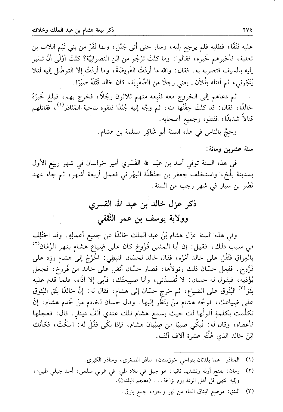 وفي هذه السنة عزل هشام بن عبد الملك خالداً عن جميع أعماله . وقد اختلف في سبب ذلك ، فقيل : إن أبا المثنى فروخ كان على ضياع هشام بنهر الرمان بالعراق فثقل على خالد أمره ، فقال خالد لحسان النبطي : اخرج إلى هشام وزد على فروخ . ففعل حسان ذلك وتولاها ، فصار حسان أئقل على خالد من فروخ ، فجعل يؤذيه ، فيقول له حسان : لا تفسدني ، وأنا صنيعتك ، فأبى إلا أذاه ، فلما قدم عليه بثق البثوق على الضياع ، ثم خرج حسان إلى هشام ، فقال له : إن خالدا بثق البثوق على ضياعك ، فوجه هشام من ينظر إليها . وقال حسان لخادم من خدم هشام : إن تكلمت بكلمةٍ أقولها لك حيث يسمع هشام فلك عندي ألف دينارٍ . قال : فعجلها فأعطاه ، وقال له : تبكى صبيا من صبيان هشام ، فإذا بكى فقل له : اسكت ، فكأنك ابن خالد الذي غلته عشرة آلاف ألف .