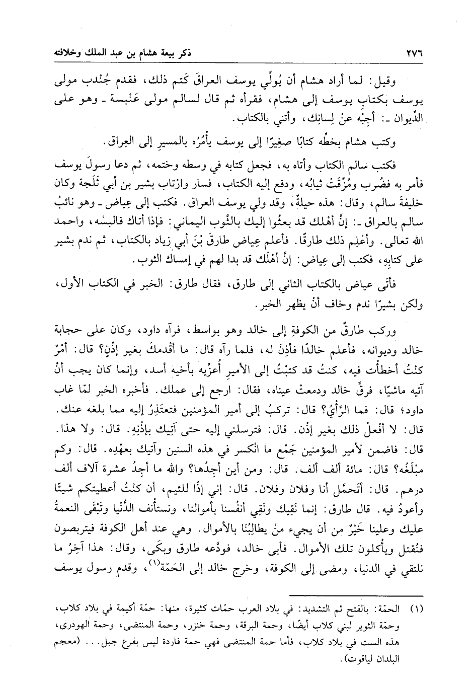 فأتى عياض بالكتاب الثاني إلى طارق ، فقال طارق : الخبر في الكتاب الأول ، ولكن بشيرا ندم وخاف أن يظهر الخبر . وركب طارقٌ من الكوفة إلى خالد وهو بواسط ، فرآه داود ، وكان على حجابة خالد وديوانه ، فأعلم خالداً فأذن له ، فلما رآه قال : ما أقدمك بغير إذن ؟ قال : أمرٌ كنت أخطأت فيه ، كنت قد كتبت إلى الأمير أعزيه بأخيه أسد ، وإنما كان يجب أن آتيه ماشياً ، فرق خالد ودمعت عيناه ، فقال : ارجع إلى عملك . فأخبره الخبر لما غاب داود ؛ قال : فما الرأي ؟ قال : تركب إلى أمير المؤمنين فتعتذر إليه مما بلغه عنك . قال : لا أفعل ذلك بغير إذن . قال : فترسلني إليه حتى آتيك بإذنه . قال : ولا هذا . قال : فاضمن لأمير المؤمنين جمع ما انكسر في هذه السنين وآتيك بعهده . قال : وكم مبلغه ؟ قال : مائة ألف ألف . قال : ومن أين أجدها ؟ والله ما أجد عشرة آلاف ألف درهم . قال : أتحمل أنا وفلان وفلان . قال : إني إذاً للئيم ، أن كنت أعطيتكم شيئاً وأعود فيه . قال طارق : إنما نقيك ونقي أنفسنا بأموالنا ، ونستأنف الدنيا وتبقى النعمة عليك وعلينا خيرٌ من أن يجيء من يطالبنا بالأموال . وهي عند أهل الكوفة فيتربصون فنقتل ويأكلون تلك الأموال . فأبى خالد ، فودعه طارق وبكى ، وقال : هذا آخر ما نلتقي في الدنيا ، ومضى إلى الكوفة ، وخرج خالد إلى الحمة ، وقدم رسول يوسف