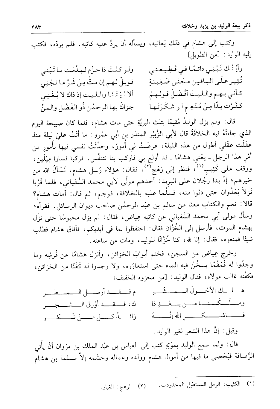 كفرت يداً من منعمٍ لو شكرتها . . . جزاك بها الرحمن ذو الفضل والمنّ قال ، ولم يزل الوليد مقيماً بتلك البرية حتى مات هشام ، فلما كان صبيحة اليوم الذي جاءته فيه الخلافة قال لأبي الزبير المنذر بن أبي عمرو : ما أتت علي ليلة منذ عقلت عقلي أطول من هذه الليلة ، عرضت لي أمورٌ ، وحدثت نفسي فيها بأمور من أمر هذا الرجل - يعني هشاما - قد أولع بي ، فاركب بنا نتنفس ، فركبا فسارا ميلين ، ووقف على كثيب ، فنظر إلى رهج ، فقال : هؤلاء رسل هشام ، نسأل الله من خيرهم ؛ إذ بدا رجلان على البريد : أحدهما مولىً لأبي محمد السفيان ، فلما قربنا نزلا يعدوان حتى دنوا منه ، فسلما عليه بالخلافة ، فوجم ، ثم قال : أمات هشام ؟ قالا : نعم والكتاب معنا من سالم ابن عبد الرحمن صاحب ديوان الرسائل . فقرأه ؛ وسأل مولى أبي محمد السفياني عن كاتبه عياض ، فقال : لم يزل محبوسا حتى نزل بهشام الموت ، فأرسل إلى الخزان فقال : احتفظوا بما في أيديكم ، فأفاق هشام فطلب شيئاً فمنعوه ، فقال : إنا لله ، كنا خزاناً للوليد ، ومات من ساعته .