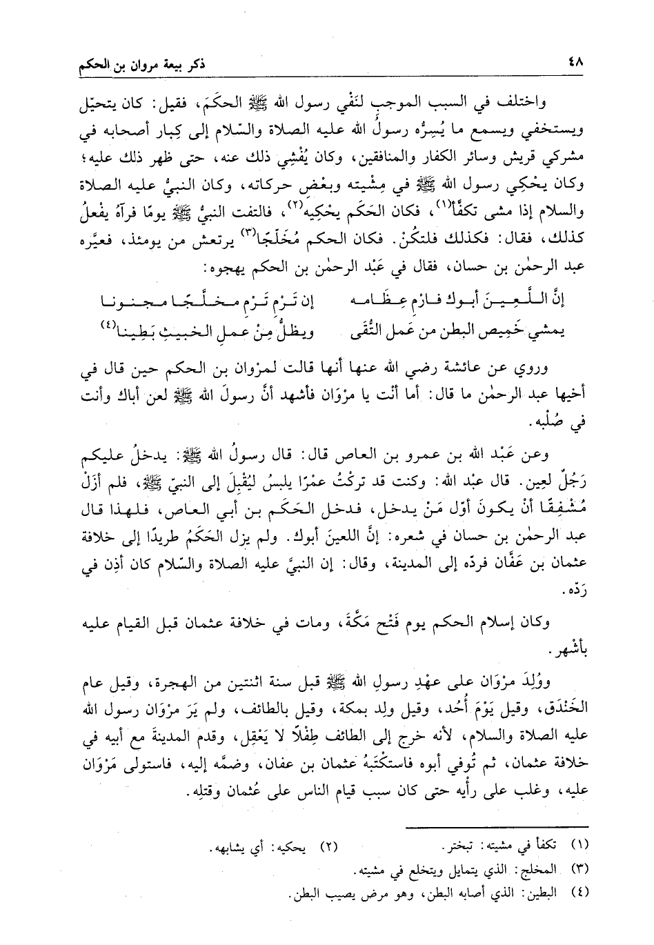 وعن عبد الله بن عمرو بن العاص قال : قال رسول الله ( صلى الله عليه وسلم ) : يدخل عليكم رجل لعين . قال عبد الله : وكنت قد تركت عمراً يلبس ليقبل إلى النبي ( صلى الله عليه وسلم ) ، فلم أزل مشفقاً أن يكون أول من يدخل ، فدخل الحكم بن أبي العاص ، فلهذا قال عبد الرحمن بن حسان في شعره : إن اللعين أبوك . ولم يزل الحكم طريدا إلى خلافة عثمان بن عفان فرده إلى المدينة ، وقال : إن النبي عليه الصلاة والسلام كان أذن في رده .