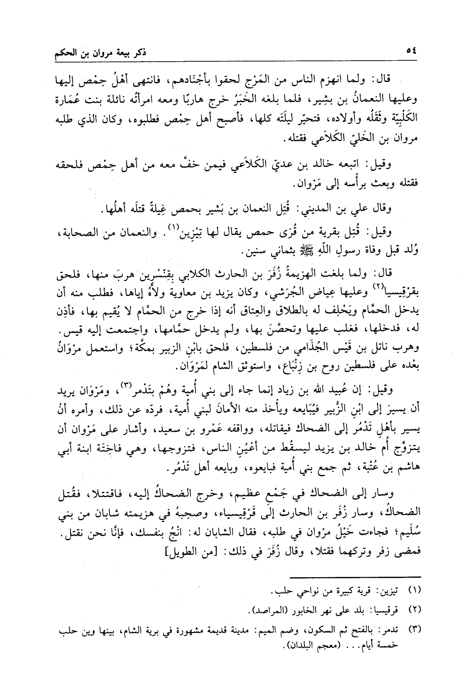قال : ولما بلغت الهزيمة زفر بن الحارث الكلابي بقنسرين هرب منها ، فلحق بقرقيسيا وعليها عياض الجرشي ، وكان يزيد بن معاوية ولاه إياها ، فطلب منه أن يدخل الحمام ويحلف له بالطلاق والعتاق أنه إذا خرج من الحمام لا يقيم بها ، فأذن له ، فدخلها ، فغلب عليها وتحصن بها ، ولم يدخل حمامها ، واجتمعت إليه قيس . وهرب ناتل بن قيس الجذامي من فلسطين ، فلحق بابن الزبير بمكة ؛ واستعمل مروان بعده على فلسطين روح بن زنباع ، واستوثق الشام لمروان . وقيل : إن عبيد الله بن زياد إنما جاء إلى بني أمية وهم بتدمر ، ومروان يريد أن يسير إلى ابن الزبير فيبايعه ويأخذ منه الأمان لبني أمية ، فرده عن ذلك ، وأمره أن يسير بأهل تدمر إلى الضحاك فيقاتله ، وواقفه عمرو بن سعيد ، وأشار على مروان أن يتزوج أم خالد ابن يزيد ليسقط من أعين الناس ، فتزوجها ، وهي فاختة ابنة أبي هاشم ابن عتبة ، ثم جمع بني أمية فبايعوه ، وبايعه أهل تدمر .