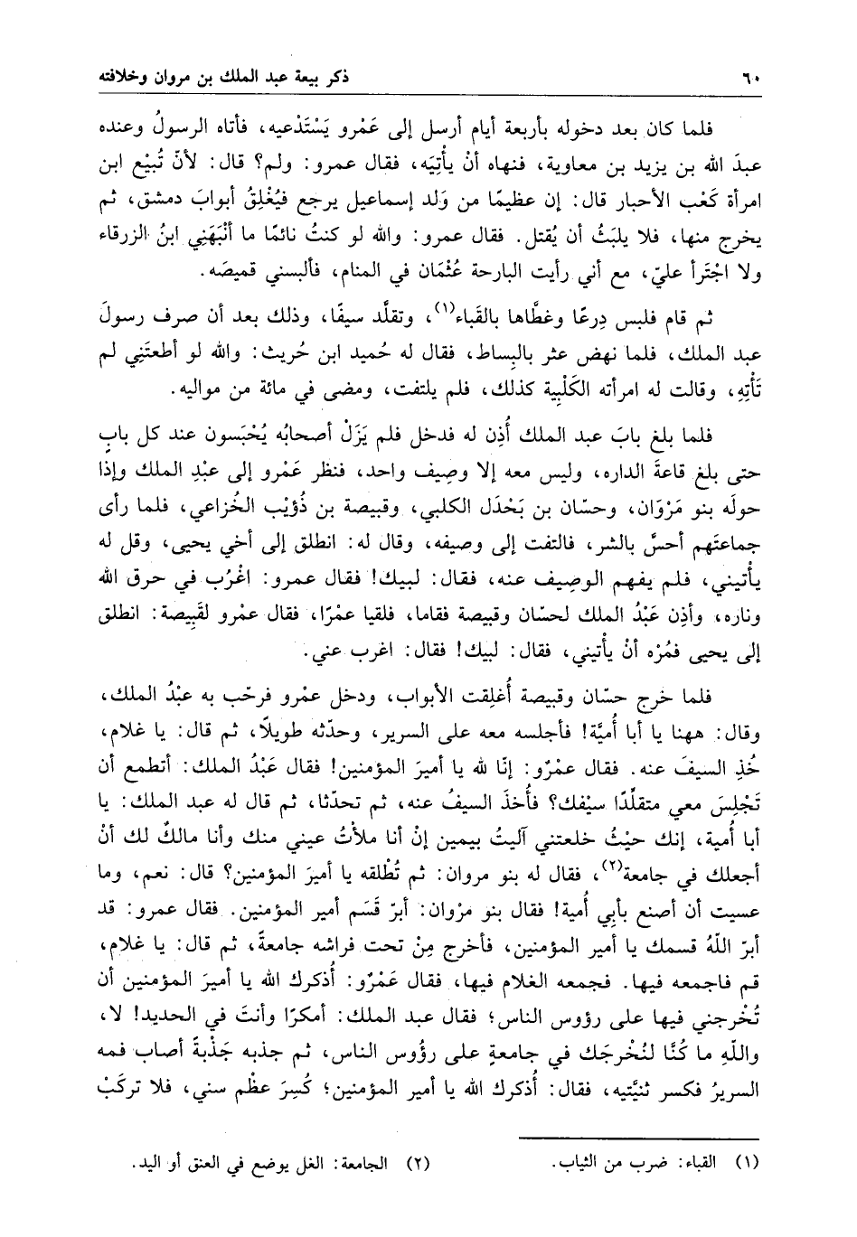 فلما بلغ باب عبد الملك أذن له فدخل فلم يزل أصحابه يحبسون عند كل باب حتى بلغ قاعة الدار ، وليس معه إلا وصيف واحد ، فنظر عمرو إلى عبد الملك وإذا حوله بنو مروان ، وحسان بن بحدل الكلبي ، وقبيصة بن ذويب الخزاعي ، فلما رأى جماعتهم أحس بالشر ، فالتفت إلى وصيفه ، وقال له : انطلق إلى أخي يحيى ، وقل له يأتين ، فلم يفهم الوصيف عنه ، فقال : لبيك فقال عمرو : اغرب في حرق الله وناره ، وأذن عبد الملك لحسان وقبيصة فقاما ، فلقيا عمراً ، فقال عمرو لقبيصة : انطلق إلى يحيى فمره أن يأتيني ، فقال : لبيك فقال : اغرب عني . فلما خرج حسان وقبيصة أغلقت الأبواب ، ودخل عمرو فرحب به عبد الملك ، وقال : ههنا يا أبا أمية فأجلسه معه على السرير ، وحدثه طويلاً ، ثم قال : يا غلام ، خذ السيف عنه . فقال عمرو : إنا لله يا أمير المؤمنين فقال عبد الملك : أتطمع أن تجلس معي متقلداً سيفك ؟ فأخذ السيف عنه ، ثم تحدثا ، ثم قال : له عبد الملك : يا أبا أمية ، إنك حيث خلعني آليت بيمين إن أنا ملأت عيني منك وأنا مالك لك أن أجعلك في جامعة ، فقال له بنو مروان : ثم تطلقه يا أمير المؤمنين ؟ قال : نعم ، وما عسيت أن أصنع بأبي أمية فقال بنو مروان : أبر قسم أمير المؤمنين . فقال عمرو : قد أبر الله قسمك يا أمير المؤمنين . فأخرج من تحت فراشه جامعة ، ثم قال : يا غلام ، قم فاجمعه فيها . فجمعه الغلام فيها ، فقال عمرو : أذكرك الله يا أمير المؤمنين أن تخرجني فيها على رءوس الناس ؛ فقال عبد الملك : أمكراً وأنت في الحديد لا والله ما كنا لنخرجك في جامعة على رءوس الناس ، ثم جذبه جذبة أصاب فمه السرير فكسر ثنيتيه ، فقال : أذكرك الله يا أمير المؤمنين ؛ كسر عظم سني ، فلا تركب