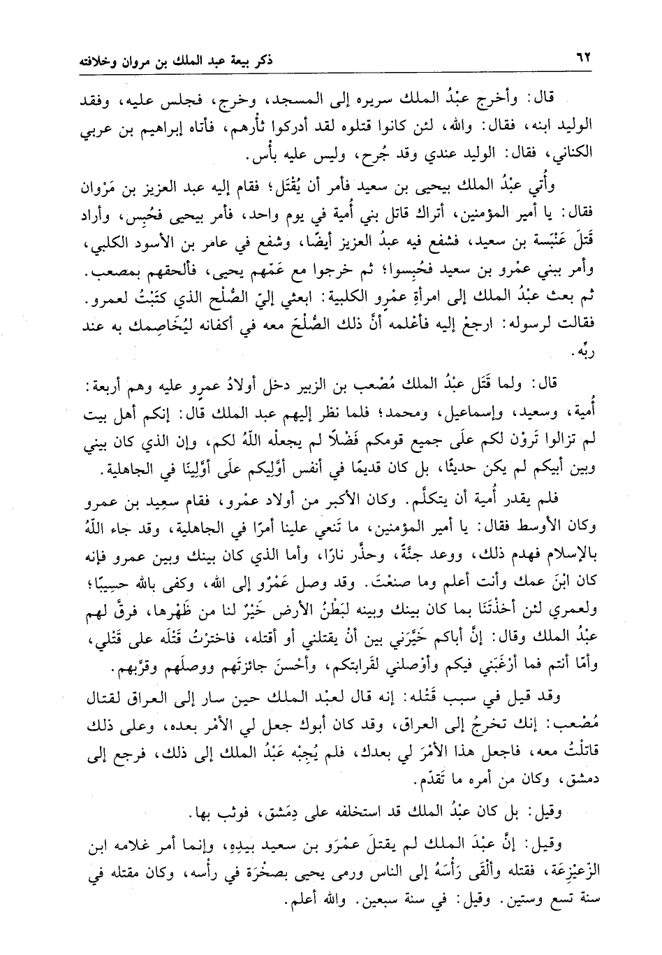 وقيل : إن عبد الملك لم يقتل عمرو بن سعيد بيده ، وإنما أمر غلامه ابن الزعيزعة ، فقتله وألقى رأسه إلى الناس ورمى يحيى بصخرة في رأسه ، وكان مقتله في سنة تسع وستين . وقيل : في سنة سبعين . والله أعلم .