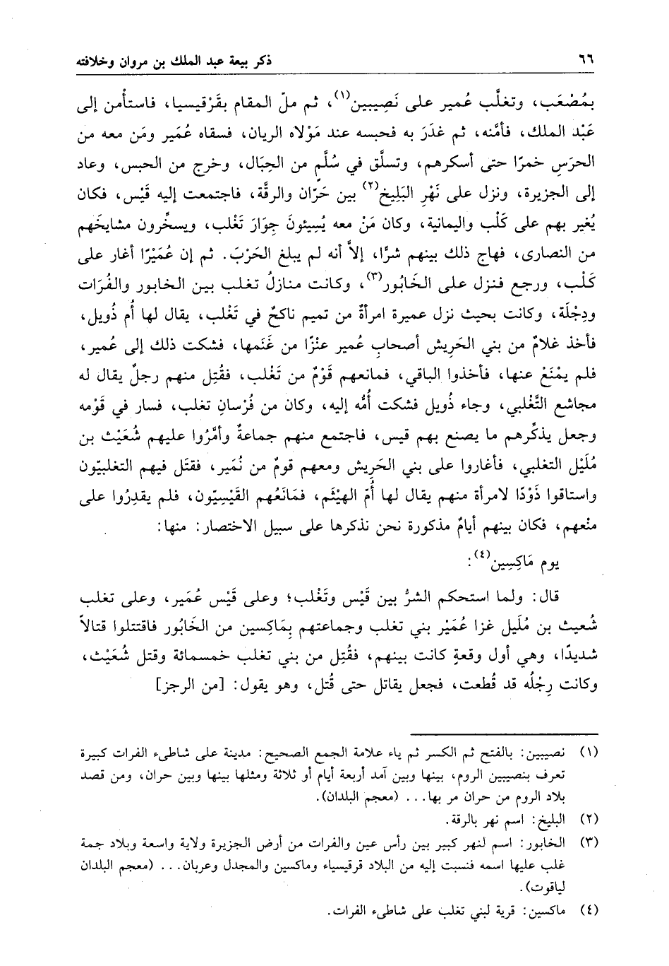 بمصعب ، وتغلب عمير على نصيبين ، ثم مل المقام بقرقيسيا ، فاستأ من إلى عبد الملك ، فأمنه ، ثم غدر به فحبسه عند مولاه الريان ، فسقاه عمير ومن معه من الحرس خمراً حتى أسكرهم ، وتسلق في سلم من الحبال ، وخرج من الحبس ، وعاد إلى الجزيرة ، ونزل على نهر البليخ بين حران والرقة ، فاجتمعت إليه قيس ، فكان يغير بهم على كلب واليمانية ، وكان من معه يسيئون جوار تغلب ، ويسخرون مشايخهم من النصارى ، فهاج ذلك بينهم شراً ، إلا أنه لم يبلغ الحرب . ثم إن عمير أغار على كلب ، ورجع فنزل على الخابور ، وكانت منازل تغلب بين الخابور والفرات ودجلة ، وكانت بحيث نزل عمير - امرأة من تميم ناكح في تغلب ، يقال لها أم ذويل ، فأخذ غلام من بني الحريش أصحاب عمير عنزاً من إنهما ، فشكت ذلك إلى عمير ، فلم يمنع عنها ، فأخذوا الباقي ، فمانعهم قوم من تغلب ، فقتل منهم رجل يقال له مجاشع التغلبي ، وجاء ذويل فشكت أمه إليه ، وكان من فرسان تغلب ، فسار في قومه وجعل يذكرهم ما يصنع بهم قيس ، فاجتمع منهم جماعة وأمروا عليهم شعيث ابن مليل التغلبي ، فأغاروا على بني الحريش ومعهم قوم من نمير ، فقتل فيهم التغلبيون واستاقوا ذوداً لامرأة منهم يقال لها أم الهيثم ، فمانعهم القيسيون ، فلم يقدروا على منعهم ، فكان بينهم أيام مذكورة نن نذكرها على سبيل الاختصار ؛ منها : يوم ماكسين : قال : ولما استحكم الشر بين قيس وتغلب ؛ وعلى قيس عمير ، وعلى تغلب شعيث بن مليل غزا عمير بني تغلب وجماعتهم بماكسين من الخابور فاقتتلوا قتالاً شديداً ، وهي أول وقعة كانت بينهم ، فقتل من بني تغلب خمسمائة وقتل شعيث ، وكانت رجله قد قطعت ، فجعل يقاتل حتى قتل ، وهو يقول :
