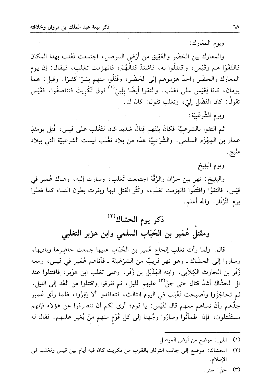 قال : ولما رأت تغلب إلحاح عمير بن الحباب عليها جمعت حاضرها وباديها ، وساروا إلى الحشاك - وهو نهر قريب من الشرعبية ، فأتاهم عمير في قيس ، ومعه زفر بن الحارث الكلابي ، وابنه الهذيل بن زفر ، وعلى تغلب ابن هوبر ، فاقتتلوا عند تل الحشاك أشد قتال حتى جن عليهم الليل ، ثم تفرقوا واقتتلوا من الغد إلى الليل ، ثم تحاجزوا وأصبحت تغلب في اليوم الثالث ، فتعاقدوا ألا يفروا ، فلما رأى عمير جدهم وأن نساءهم معهم قال لقيس : يا قوم ؛ أرى لكم أن تنصرفوا عن هؤلاء فإنهم مستقتلون ، فإذا اطمأنوا وساروا وجهنا إلى كل قوم منهم من يغير عليهم . فقال له