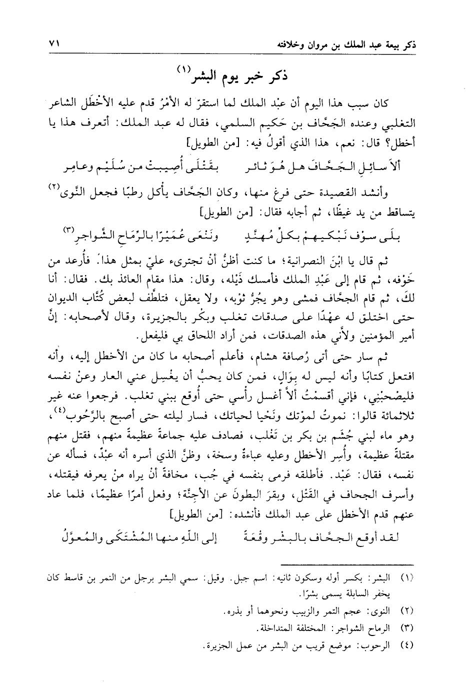 ثم سار حتى أتى رصافة هشام ، فأعلم أصحابه ما كان من الأخطل إليه ، وأنه افتعل كتاباً وأنه ليس له بوال ، فمن كان يحب أن يغسل عني العار وعن نفسه فليصحبني ، فإني أقسمت ألا أغسل رأسي حتى أوقع ببني تغلب . فرجعوا عنه غير ثلاثمائة قالوا : نموت لموتك ونحيا لحياتك ، فسار ليلته حتى أصبح بالرحوب ، وهو ماء لبني جشم بن بكر بن تغلب ، فصادف عليه جماعة عظيمة منهم ، فقتل منهم مقتلة عظيمة ، وأسر الأخطل وعيه عباءة وسخة ، وظن الذي أسره أنه عبد ، فسأله عن نفسه ، فقال : عبد . فأطلقه فرمى بنفسه في جب ، مخافة أن يراه من يعرفه فيقتله ، وأسرف الجحاف في القتل ، وبقر البطون عن الأجنة ؛ وفعل أمراً عظيماً ، فلما عاد عنهم قدم الأخطل على عبد الملك فأنشده :