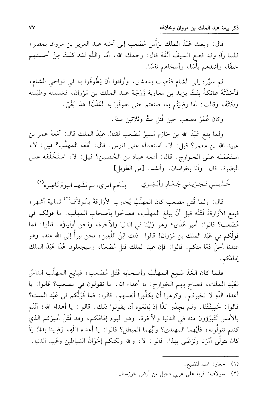 قال : ولما قتل مصعب كان المهلب يحارب الأزارقة بسولاف ثمانية أشهر ، فبلغ الأزارقة قتله قبل أن يبلغ المهلب ، فصاحوا بأصحاب المهلب : ما قولكم في مصعب ؟ قالوا : أمير هدى ؛ وهو ولينا في الدنيا والآخرة ، ونحن أولياؤه . قالوا : فما قولكم في عبد الملك بن مروان قالوا : ذلك ابن اللعين ، نحن نبرأ إلى الله منه ، وهو عندنا حل دماً منكم . قالوا : فإن عبد الملك قتل مصعباً ، وسيجعلون غداً عبد الملك إمامكم .