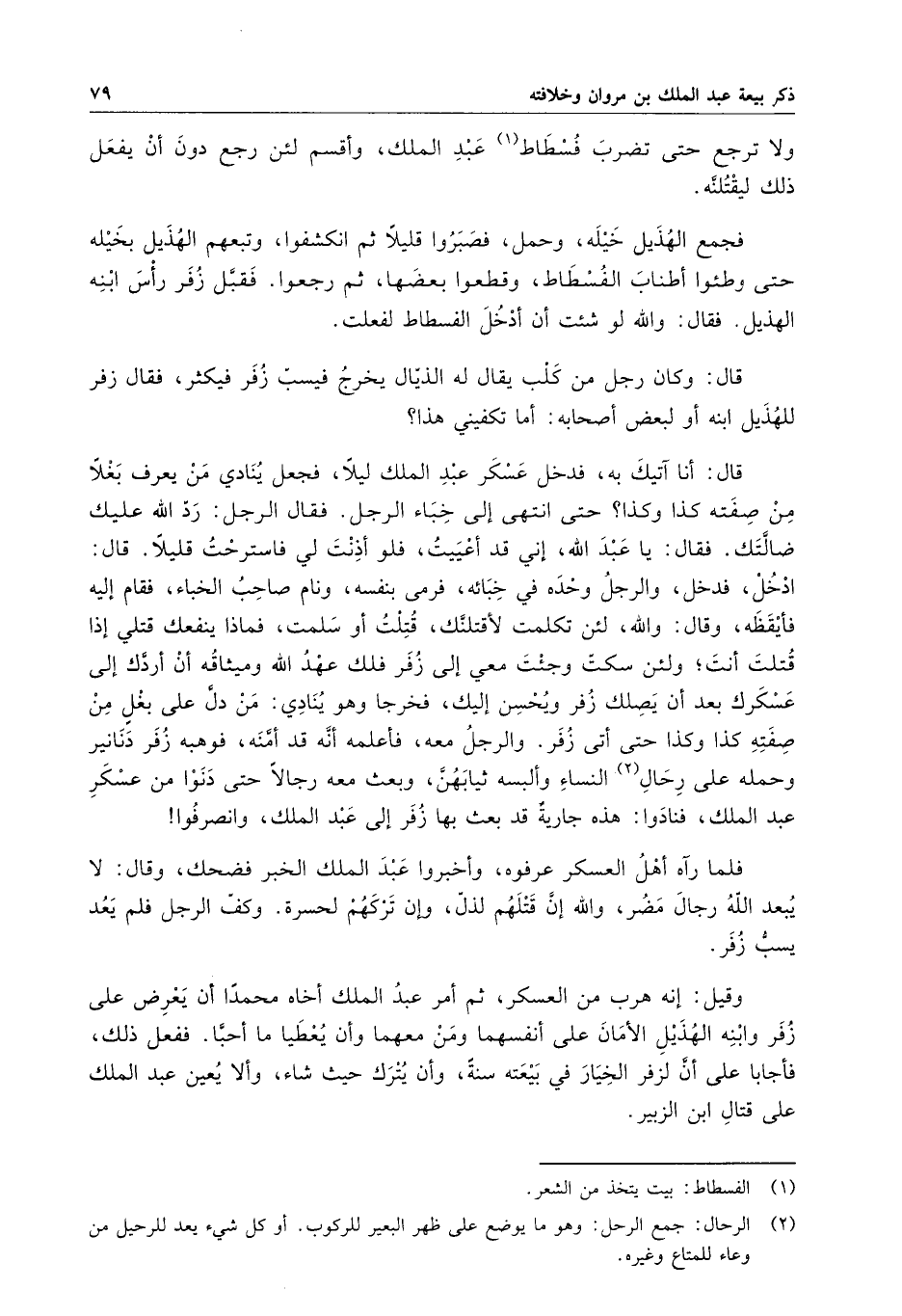 قال : وكان رجل من كلب يقال له الذيال يخرج فيسب زفر فيكثر ، فقال للهذيل ابنه أو لبعض أصحابه : أما تكفيني هذا ؟ قال : أنا آتيك به ، فدخل عسكر عبد الملك ليلاً ، فجعل ينادي من يعرف بغلا من صفته كذا وكذا ؟ حتى انتهى إلى خباء الرجل . فقال الرجل : رد الله عليك ضالتك . فقال : يا عبد الله ، إني قد أعييت ، فلو أذنت لي فاسترحت قليلاً . قال : ادخل ، فدخل ، والرجل وحده في خبائه ، فرمى بنفسه ، ونام صاحب الخباء ، فقام إليه فأيقظه ، وقال : والله ، لئن تكلمت لاقتلنك ، قتلت أو سلمت ، فماذا ينفعك قتلي إذا قتلت أنت ؛ ولئن سكت وجئت معي إلى زفر فلك عهد الله وميثاقه أن أردك إلى عسكرك بعد أن يصلك زفر ويحسن إليك ، فخرجا وهو ينادي : من دل على بغل من صفته كذا وكذا حتى أتى زفر . والرجل معه ، فأعلمه أنه قد أمنه ، فوهبه زفر دنانير وحمله على رحال النساء وألبسه ثيابهن ، وبعث معه رجالاً حتى دنوا من عسكر عبد الملك ، فنادوا : هذه جارية قد بعث بها زفر إلى عبد الملك ، وانصرفوا فلما رآه أهل العسكر عرفوه ، وأخبروا عبد الملك الخبر فضحك ، وقال : لا يبعد الله رجال مضر ، والله إن قتلهم لذل ، وإن تركهم لحسرة . وكف الرجل فلم يعد يسب زفر .