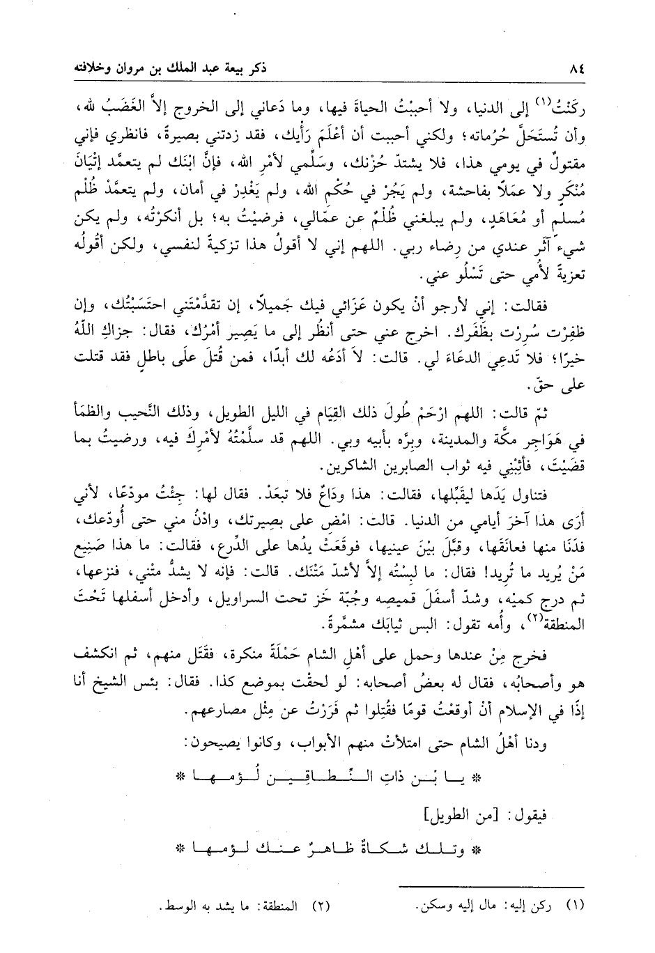 فتناول يدها ليقبلها ، فقالت : هذا وداع فلا تبعد . فقال لها : جئت مودعاً ، لأني أرى هذا آخر أيامي من الدنيا . قالت : امض على بصيرتك ، وادن مني حتى أودعك ، فدنا منها فعانقها ، وقبل بين عينيها ، فوقعت يدها على الدرع ، فقالت : ما هذا صنيع من يريد ما تريد فقال : ما لبسته إلا لأشد متنك . قالت : فإنه لا يشد متني ، فنزعها ، ثم درج كميه ، وشد أسفل قميصه وجبة خز تحت السراويل ، وأدخل أسفلها تحت المنطقة ، وأمه تقول : البس ثيابك مشمرة .