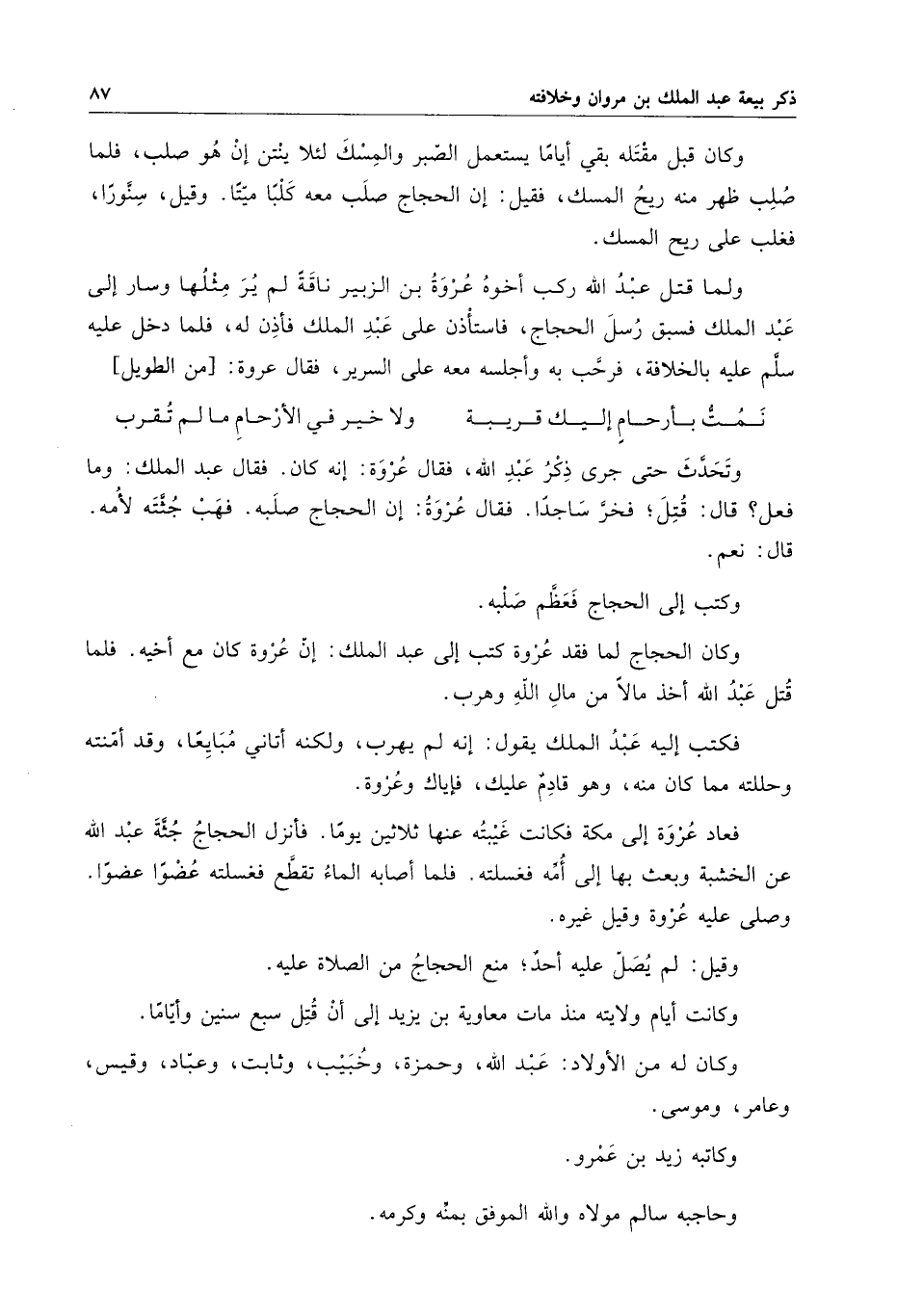 وتحدث حتى جرى ذكر عبد الله ، فقال عروة : إنه كان . فقال عبد الملك : وما فعل ؟ قال : قتل ؛ فخر ساجداً . فقال عروة : إن الحجاج صلبه . فهب جثته لأمه . قال : نعم .