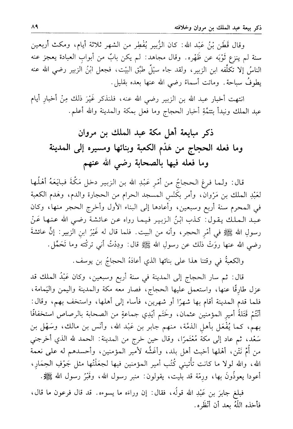 قال : ولما فرغ الحجاج من أمر عبد الله بن الزبير دخل مكة فبايعه أهلها لعبد الملك بن مروان ، وأمر بكنس المسجد الحرام من الحجارة والدم ، وهدم الكعبة في المحرم سنة أربع وسبعين ، وأعادها إلى البناء الأول وأخرج الحجر منها ، وكان عبد الملك يقول : كذب ابن الزبير فيما رواه عن عائشة رضي الله عنها عن رسول الله ( صلى الله عليه وسلم ) في أمر الحجر ، وأنه من البيت . فلما قال له غير ابن الزبير : إن عائشة رضي الله عنها روت ذلك عن رسول الله ( صلى الله عليه وسلم ) قال : وددت أني تركته وما تحمل .