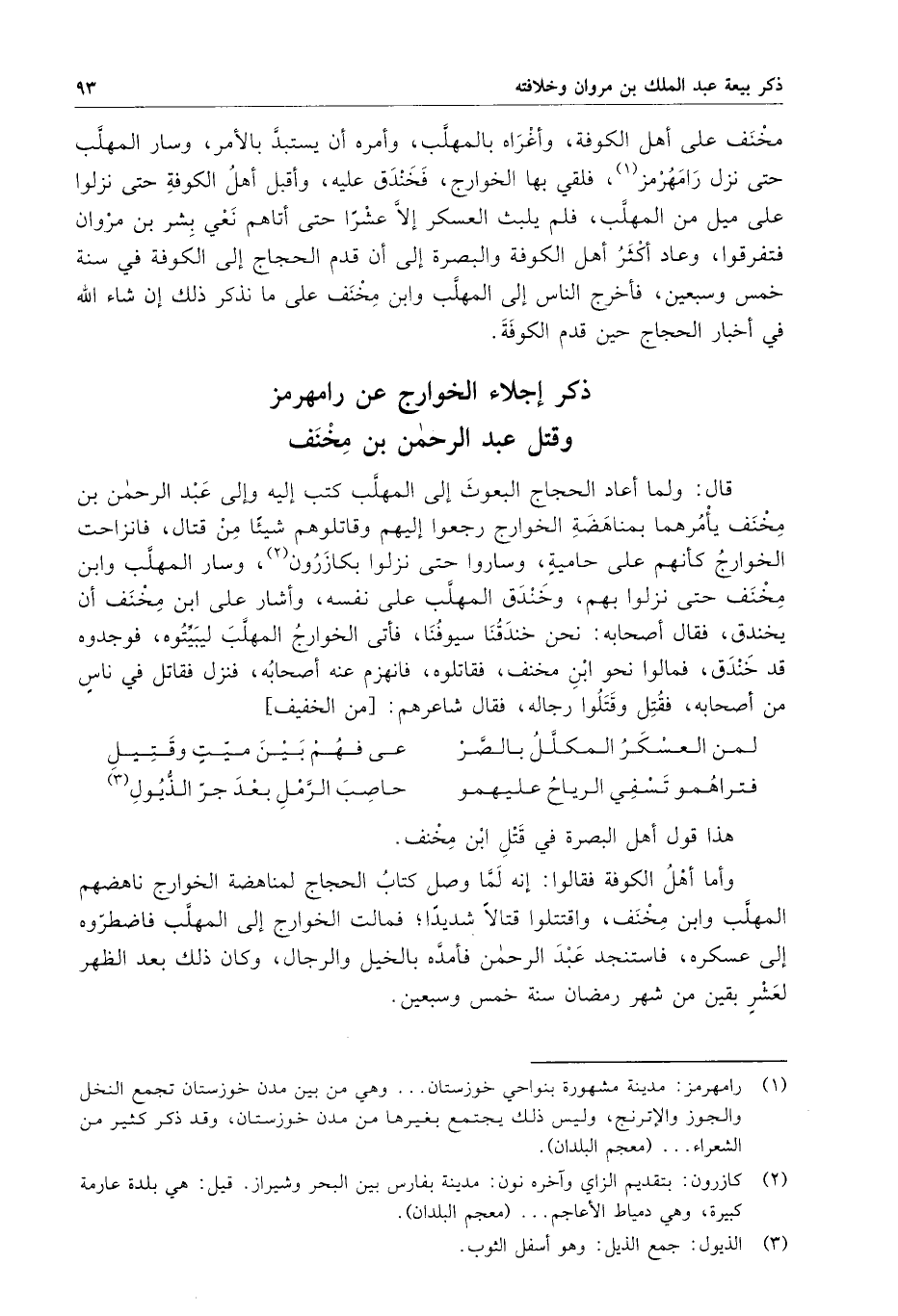 قال : ولما أعاد الحجاج البعوث إلى المهلب كتب إليه وإلى عبد الرحمن بن مخنف يأمرهما بمناهضة الخوارج رجعوا إليهم وقاتلوهم شيئاً من قتال ، فانزاحت الخوارج كأنهم على حاميةٍ ، وساروا حتى نزلوا بكازرون ، وسار المهلب وابن مخنف حتى نزلوا بهم ، وخندق المهلب على نفسه ، وأشار على ابن مخنف أن يخندق ، فقال أصحابه : نحن خندقنا سيوفنا ، فأتى الخوارج المهلب ليبيتوه ، فوجدوه قد خندق ، فمالوا نحو ابن مخنف ، فقاتلوه ، فانهزم عنه أصحابه ، فنزل فقاتل في ناسٍ من أصحابه ، فقتل وقتلوا رجاله ، فقال شاعرهم :