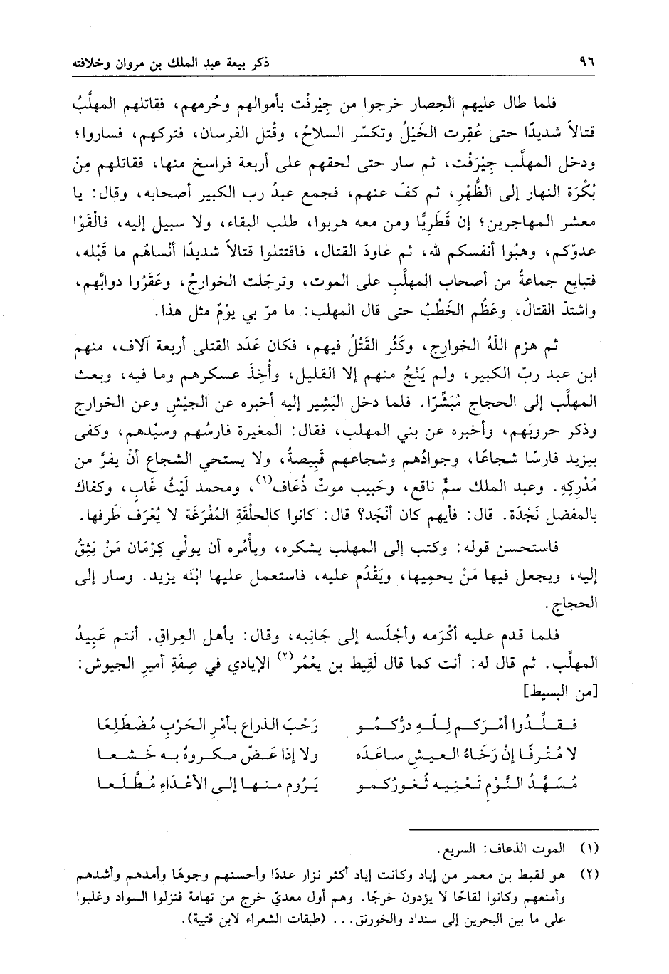 ثم هزم الله الخوارج ، وكثر القتل فيهم ، فكان عدد القتلى أربعة آلاف ، منهم ابن عبد رب الكبير ، ولم ينج منهم إلا القليل ، وأخذ عسكرهم وما فيه ، وبعث المهلب إلى الحجاج مبشراً . فلما دخل البشير إليه أخبره عن الجيش وعن الخوارج وذكر حروبهم ، وأخبره عن بني المهلب ، فقال : المغيرة فارسهم وسيدهم ، وكفى بيزيد فارساً شجاعاً ، وجوادهم وشجاعهم قبيصة ، ولا يستحي الشجاع أن يفر من مدركه . وعبد الملك سمٌ ناقع ، وحبيب موتٌ ذعاف ، ومحمد ليث غابٍ ، وكفاك بالمفضل نجدة . قال : فأيهم كان أنجد ؟ قال : كانوا كالحلقة المفرغة لا يعرف طرفها .