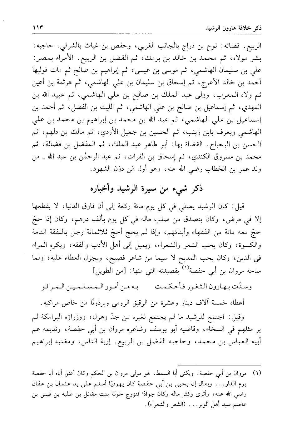 أعطاه خمسة آلاف دينار وعشرة من الرقيق الرومي وبرذوناً من خاص مراكبه . وقيل : اجتمع للرشيد ما لم يجتمع لغيره من جد وهزل ، ووزراؤه البرامكة لم ير مثلهم في السخاء ، وقاضيه أبو يوسف وشاعره مروان بن أبي حفصة ، ونديمه عم أبيه العباس بن محمد ، وحاجبه الفضل بن الربيع . إربة الناس ، ومغنيه إبراهيم
