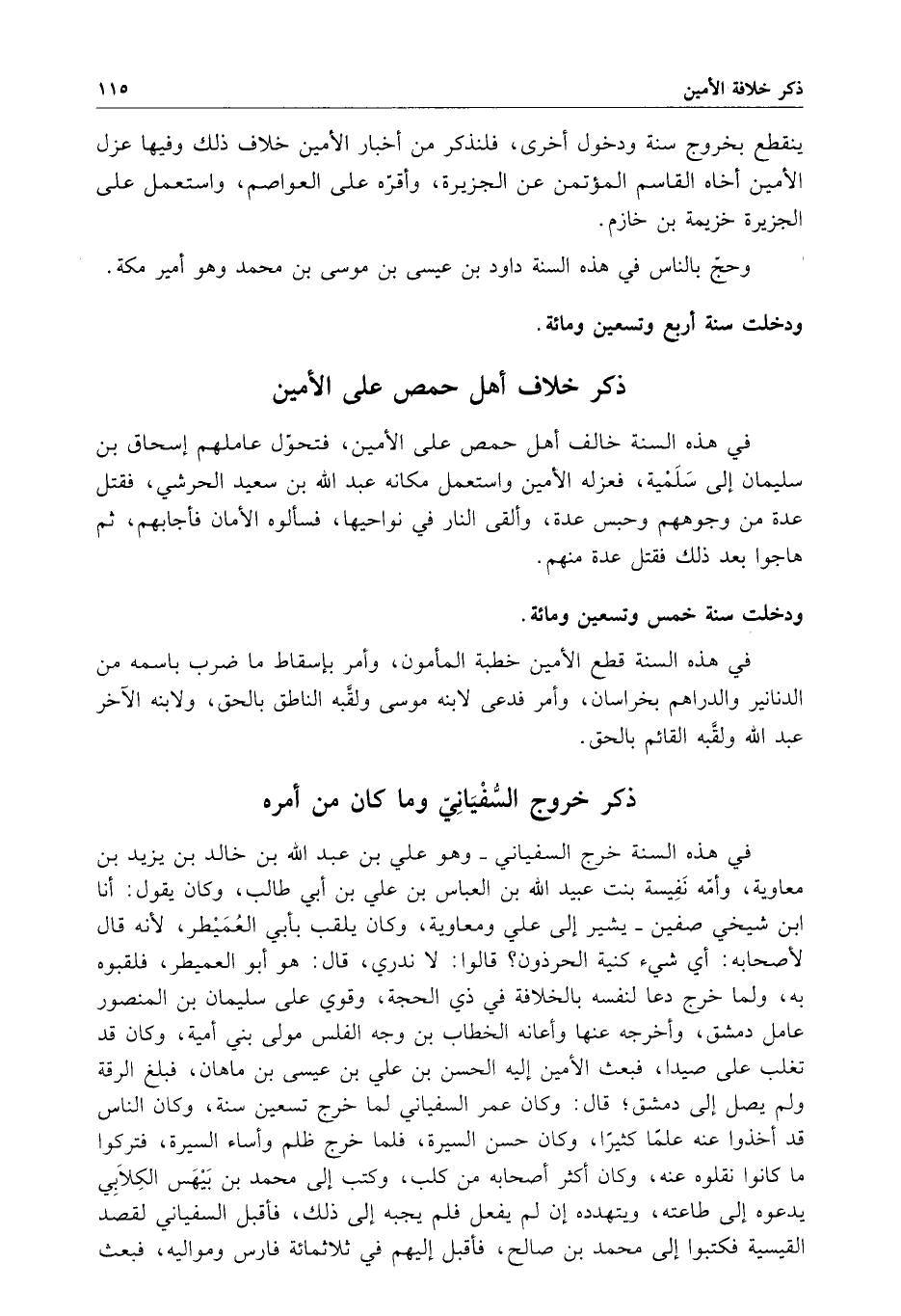في هذه السنة خرج السفياني - وهو علي بن عبد الله بن خالد بن يزيد بن معاوية ، وأمه نفيسة بنت عبيد الله بن العباس بن علي بن أبي طالب ، وكان يقول : أنا ابن شيخي صفين - يشير إلى علي ومعاوية ، وكان يلقب بأبي العميطر ، لأنه قال لأصحابه : أي شيء كنية الحرذون ؟ قالوا : لا ندري ، قال : هو أبو العميطر ، فلقبوه به ، ولما خرج دعا لنفسه بالخلافة في ذى الحجة ، وقوي على سليمان بن المنصور عامل دمشق ، وأخرجه عنها وأعانه الخطاب بن وجه الفلس مولى بني أمية ، وكان قد تغلب على صيدا ، فبعث الأمين إليه الحسن بن علي بن عيسى بن ماهان ، فبلغ الرقة ولم يصل إلى دمشق ، قال : وكان عمر السفياني لما خرج تسعين سنة ، وكان الناس قد أخذوا عنه علماً كثيراً ، وكان حسن السيرة ، فلما خرج ظلم وأساء السيرة ، فتركوا ما كانوا نقلوه عنه ، وكان أكثر أصحابه من كلب ، وكتب إلى محمد بن بيهس الكلابي يدعوه إلى طاعته ، ويتهدده إن لم يفعل فلم يجبه إلى ذلك ، فأقبل السفياني لقصد القيسية فكتبوا إلى محمد بن صالح ، فأقبل إليهم في ثلاثمائة فارس ومواليه ، فبعث