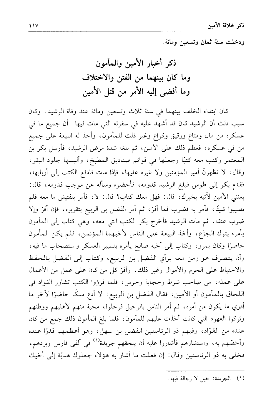 ذكر أخبار الأمين والمأمون وما كان بينهما من الفتن والاختلاف وما أفضى إليه الأمر من قتل الأمين
