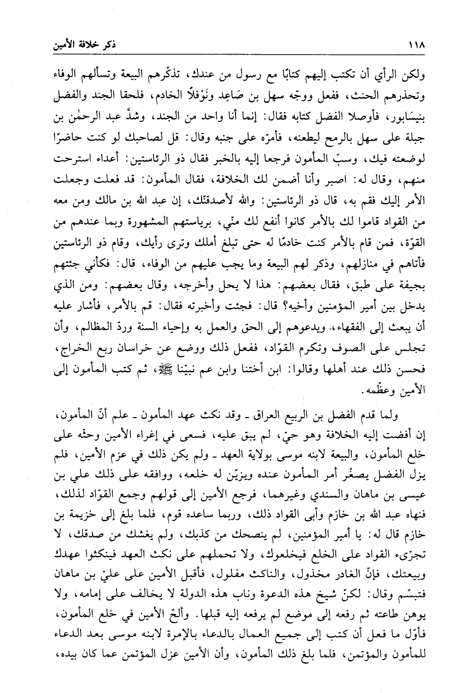 ولكن الرأي أن تكتب إليهم كتاباً مع رسول من عندك ، تذكرهم البيعة وتسألهم الوفاء وتحذرهم الحنث ، ففعل ووجه سهل بن صاعد ونوفلاً الخادم ، فلحقا الجند والفضل بنيسابور ، فأوصلا الفضل كتابه فقال : إنما أنا واحد من الجند ، وشد عبد الرحمن بن جبلة على سهل بالرمح ليطعنه ، فأمره على جنبه وقال : قل لصاحبك لو كنت حاضراً لوضعته فيك ، وسب المأمون فرجعا إليه بالخير فقال ذو الرئاستين : أعداء استرحت منهم ، وقال له : اصبر وأنا أضمن لك الخلافة ، فقال المأمون : قد فعلت وجعلت الأمر إليك فقم به ، قال ذو الرئاستين : والله لأصدقنك ، إن عبد الله بن مالك ومن معه من القواد قاموا لك بالأمر كانوا أنفع لك مني ، برياستهم المشهورة وبما عندهم من القوة ، فمن قام بالأمر كنت خادماً له حتى تبلغ أملك وترى رأيك ، وقام ذو الرئاستين فأتاهم في منازلهم ، وذكر لهم البيعة وما يجب عليهم من الوفاء ، قال : فكأني جئتهم بجيفة على طبق ، فقال بعضهم : هذا لا يحل وأخرجه ، وقال بعضهم : ومن الذي يدخل بين أمير المؤمنين وأخيه ؟ قال : فجئت وأخبرته فقال : قم بالأمر ، فأشار عليه أن يبعث إلى الفقهاء ، ويدعوهم إلى الحق والعمل به وإحياء السنة ورد المظالم ، وأن تجلس على الصوف وتكرم القواد ، ففعل ذلك ووضع عن خراسان ربع الخراج ، فحسن ذلك عند أهلها وقالوا : ابن أختنا وابن عم نبينا ( صلى الله عليه وسلم ) ، ثم كتب المأمون إلى الأمين وعظمه . ولما قدم الفضل بن الربيع العراق - وقد نكث عهد المأمون - علم أن المأمون ، إن أفضت إليه الخلافة وهو حي ، لم يبق عليه ، فسعى في إغراء الأمين وحثه على خلع المأمون ، والبيعة لابنه موسى بولاية العهد - ولم يكن ذلك في عزم الأمين ، فلم يزل الفضل يصغر أمر المأمون عنده ويزين له خلعه ، ووافقه على ذلك علي بن عيسى بن ماهان والسندي وغيرهما ، فرجع الأمين إلى قولهم وجمع القواد لذلك ، فنهاه عبد الله بن خازم وأبى القواد ذلك ، وربما ساعده قوم ، فلما بلغ إلى خزيمة بن خازم قال له : يا أمير المؤمنين ، لم ينصحك من كذبك ، ولم يغشك من صدقك ، لا تجريء القواد على الخلع فيخلعوك ، ولا تحملهم على نكث العهد فينكثوا عهدك وبيعتك ، فإن الغادر مخذول ، والناكث مفلول ، فأقبل الأمين على علي بن ماهان فتبسم وقال : لكن شيخ هذه الدعوة وناب هذه الدولة لا يخالف على إمامه ، ولا يوهن طاعته ثم رفعه إلى موضع لم يرفعه إليه قبلها ، وألح الأمين في خلع المأمون ، فأول ما فعل أن كتب إلى جميع العمال بالدعاء بالإمرة لابنه موسى بعد الدعاء للمأمون والمؤتمن ، فلما بلغ ذلك المأمون ، وأن الأمين عزل المؤتمن عما كان بيده ،