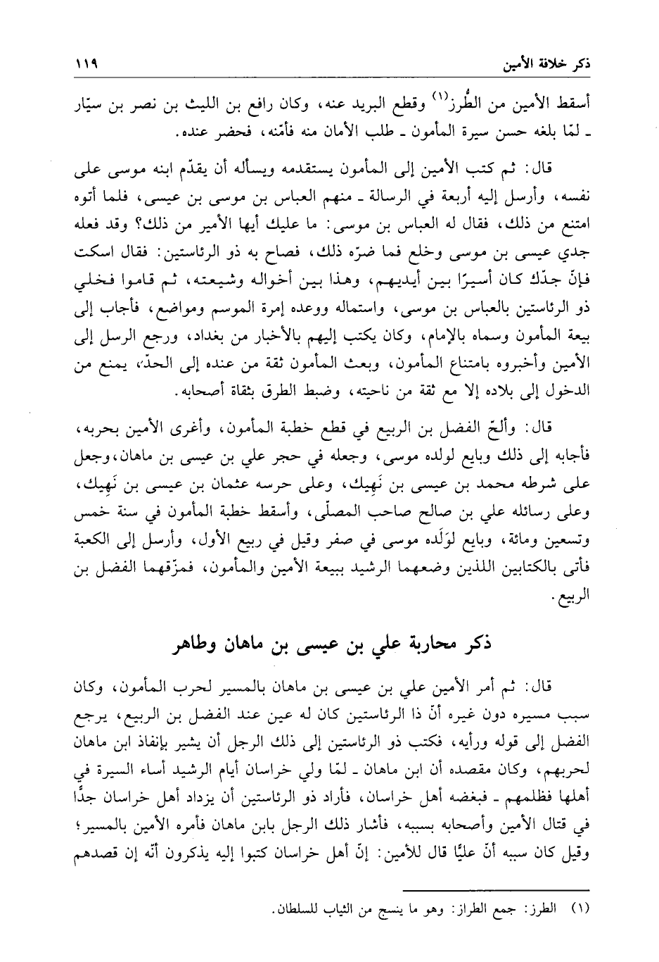 قال : ثم كتب الأمين إلى المأمون يستقدمه ويسأله أن يقدم ابنه موسى على نفسه ، وأرسل إليه أربعة في الرسالة - منهم العباس بن موسى بن عيسى ، فلما أتوه امتنع من ذلك ، فقال له العباس بن موسى : ما عليك أيها الأمير من ذلك ؟ وقد فعله جدي عيسى بن موسى وخلع فما ضره ذلك ، فصاح به ذو الرئاستين : فقال اسكت فإن جدك كان أسيراً بين أيديهم ، وهذا بين أخواله وشيعته ، ثم قاموا فخلى ذو الرئاستين بالعباس بن موسى ، واستماله ووعده إمرة الموسم ومواضع ، فأجاب إلى بيعة المأمون وسماه بالإمام ، وكان يكتب إليهم بالأخبار من بغداد ، ورجع الرسل إلى الأمين وأخبروه بامتناع المأمون ، وبعث المأمون ثقة من عنده إلى الحد ، يمنع من الدخول إلى بلاده إلا مع ثقة من ناحيته ، وضبط الطرق بثقاة أصحابه .