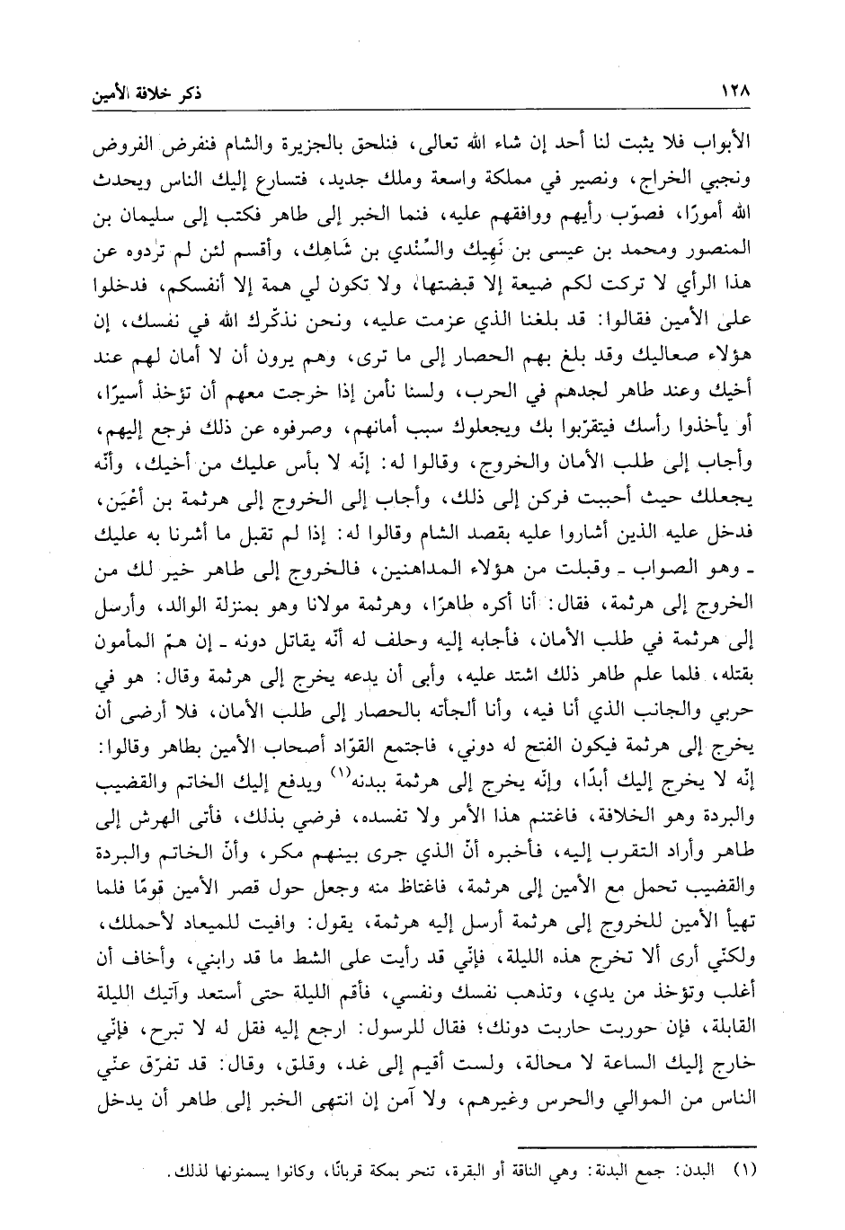الأبواب فلا يثبت لنا أحد إن شاء الله تعالى ، فلنحق بالجزيرة والشام فنفرض الفروض ونجبي الخراج ، ونصير في مملكة واسعة وملك جديد ، فتسارع إليك الناس ويحدث الله أموراً ، فصوب رأيهم ووافقهم عليه ، فنما الخبر إلى طاهر فكتب إلى سليمان بن المنصور ومحمد بن عيسى بن نهيك والسندي بن شاهك ، وأقسم لئن لم تردوه عن هذا الرأي لا تركت لكم ضيعة إلا قبضتها ، ولا تكون لي همة إلا أنفسكم ، فدخلوا على الأمين فقالوا : قد بلغنا الذي عزمت عليه ، ونحن نذكرك الله في نفسك ، إن هؤلاء صعاليك وقد بلغ بهم الحصار إلى ما ترى ، وهم يرون أن لا أمان لهم عند أخيك وعند طاهر لجدهم في الحرب . ولسنا نأمن إذا خرجت معهم أن تؤخذ أسيراً . أو ياخذوا رأسك فيتقربوا بك ويجعلوك سبب أمانهم ، وصرفوه عن ذلك فرجع إليهم ، وأجاب إلى طلب الأمان والخروج ، وقالوا له : إنه لا بأس عليك من أخيك ، وأنه يجعلك حيث أحببت فركن إلى ذلك ، وأجاب إلى الخروج إلى هرثمة بن أعين ، فدخل عليه الذين أشاروا عليه بقصد الشام وقالوا له : إذا لم تقبل ما أشرنا به عليك - وهو الصواب - وقبلت من هؤلاء المداهنين ، فالخروج إلى طاهر خير لك من الخروج إلى هرثمة ، فقال : أنا أكره طاهراً ، وهرثمة مولانا وهو بمنزلة الوالد ، وأرسل إلى هرثمة في طلب الأمان ، فأجابه إليه وحلف له أنه يقاتل دونه - إن هم المأمون بقتله ، فلما علم طاهر ذلك اشتد عليه ، وأبى أن يدعه يخرج إلى هرثمة وقال : هو في حربي والجانب الذي أنا فيه ، وأنا ألجأته إلى بالحصار إلى طلب الأمان ، فلا أرضى أن يخرج إلى هرثمة فيكون الفتح له دوني ، فاجتمع القواد أصحاب الأمين بطاهر وقالوا : إنه لا يخرج إليك أبداً ، وإنه يخرج إلى هرثمة ببدنه ويدفع إليك الخاتم والقضيب والبردة وهو الخلافة ، فاغتنم هذا الأمر ولا تفسده ، فرضي بذلك ، فأتى الهرش إلى طاهر وأراد التقرب إليه ، فأخبره أن الذي جرى بينهم مكر ، وأن الخاتم والبردة والقضيب تحمل مع الأمين إلى هرثمة ، فاغتاظ منه وجعل حول قصر الأمين قوماً فلما تهيأ الأمين للخروج إلى هرثمة أرسل إليه هرثمة ، يقول : وافيت للميعاد لأحملك ، ولكني أرى ألا تخرج هذه الليلة ، فإني قد رأيت على الشط ما قد رابني ، وأخاف أن أغلب وتؤخذ من يدي ، وتذهب نفسك ونفسي ، فأقم الليلة حتى أستعد وآتيك الليلة القابلة ، فإن حوربت حاربت دونك ، فقال للرسول : ارجع إليه فقل له لا تبرح ، فإني خارج إليك الساعة لا محالة ، ولست أقيم إلى غد ، وقلق ، وقال : قد تفرق عني الناس من الموالي والحرس وغيرهم ، ولا آمن إن انتهى الخبر إلى طاهر أن يدخل