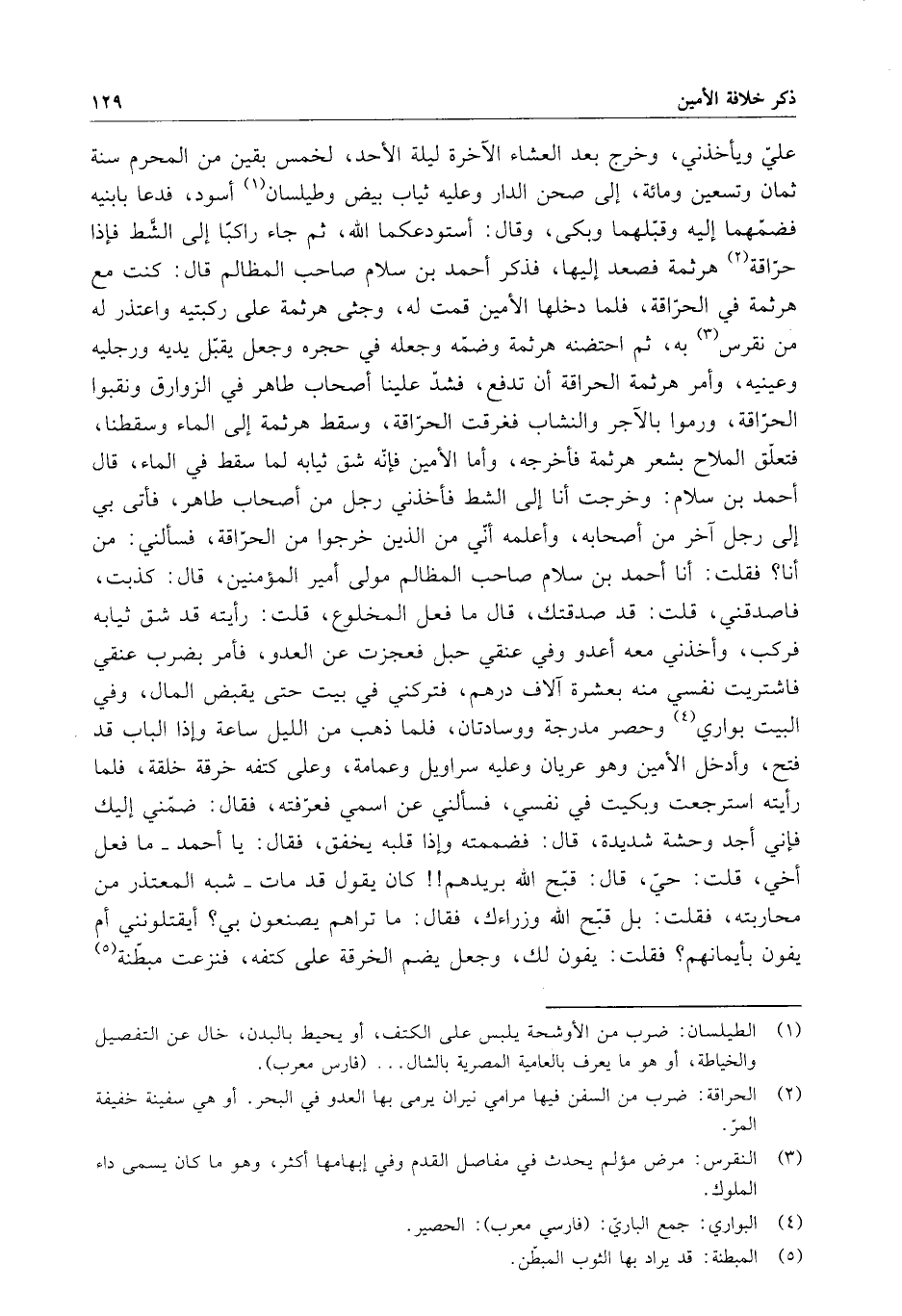 علي ويأخذني ، وخرج بعد العشاء الآخرة ليلة الأحد ، لخمس بقين من المحرم سنة ثمان وتسعين ومائة ، إلى صحن الدار وعليه ثياب بيض وطيلسان أسود ، فدعا بابنيه فضمهما إليه وقبلهما وبكى ، وقال : استودعكما الله ، ثم جاء راكباً إلى الشط فإذا حراقة هرثمة فصعد إليها ، فذكر أحمد بن سلام صاحب المظالم قال : كنت مع هرثمة في الحراقة ، فلما دخلها الأمين قمت له ، وجثى هرثمة على ركبتيه واعتذر له من نقرس به ، ثم احتضنه هرثمة وضمه وجعله في حجره وجعل يقبل يديه ورجليه وعينيه ، وأمر هرثمة الحراقة أن تدفع ، فشد علينا أصحاب طاهر في الزوارق ونقبوا الحراقة ، ورموا بالآجر والنشاب فغرقت الحراقة ، وسقط هرثمة إلى الماء وسقطنا ، فتعلق الملاح بشعر هرثمة فأخرجه ، وأما الأمين فإنه شق ثيابه لما سقط في الماء ، قال أحمد بن سلام : وخرجت أنا إلى الشط فأخذني رجل من أصحاب طاهر ، فأتى بي إلى رجل آخر من أصحابه ، وأعلمه أني من الذين خرجوا من الحراقة ، فسألني : من أنا ؟ فقلت : أنا أحمد بن سلام صاحب المظالم مولي أمير المؤمنين ، قال : كذبت ، فاصدقني ، قلت : قد صدقتك ، قال ما فعل المخلوع ، قلت : رأيته قد شق ثيابه فركب ، وأخذني معه أعدو وفي عنقي حبل فعجزت عن العدو ، فأمر بضرب عنقي فاشتريت نفسي منه بعشرة آلاف درهم ، فتركني في بيت حتى يقبض المال ، وفي البيت بواري وحصر مدرجة ووسادتان ، فلما ذهب من الليل ساعة وإذا الباب قد فتح ، وأدخل الأمين وهو عريان وعليه سراويل وعمامة ، وعلى كتفه خرقة خلقة ، فلما رأيته استرجعت وبكيت في نفسي ، فسألني عن اسمي فعرفته ، فقال : ضمني إليك فإني أجد وحشة شديدة ، قال : فضممته وإذا قلبه يخفق ، فقال : يا أحمد - ما فعل أخي ، قلت : حي ، قال : قبح الله بريدهم كان يقول قد مات - شبه المعتذر من محاربته ، فقلت : بل قبح الله وزراءك ، فقال : ما تراهم يصنعون بي ؟ أيقتلونني أم يفون بأيمانهم ؟ فقلت : يفون لك ، وجعل يضم الخرقة على كتفه ، فنزعت مبطنة