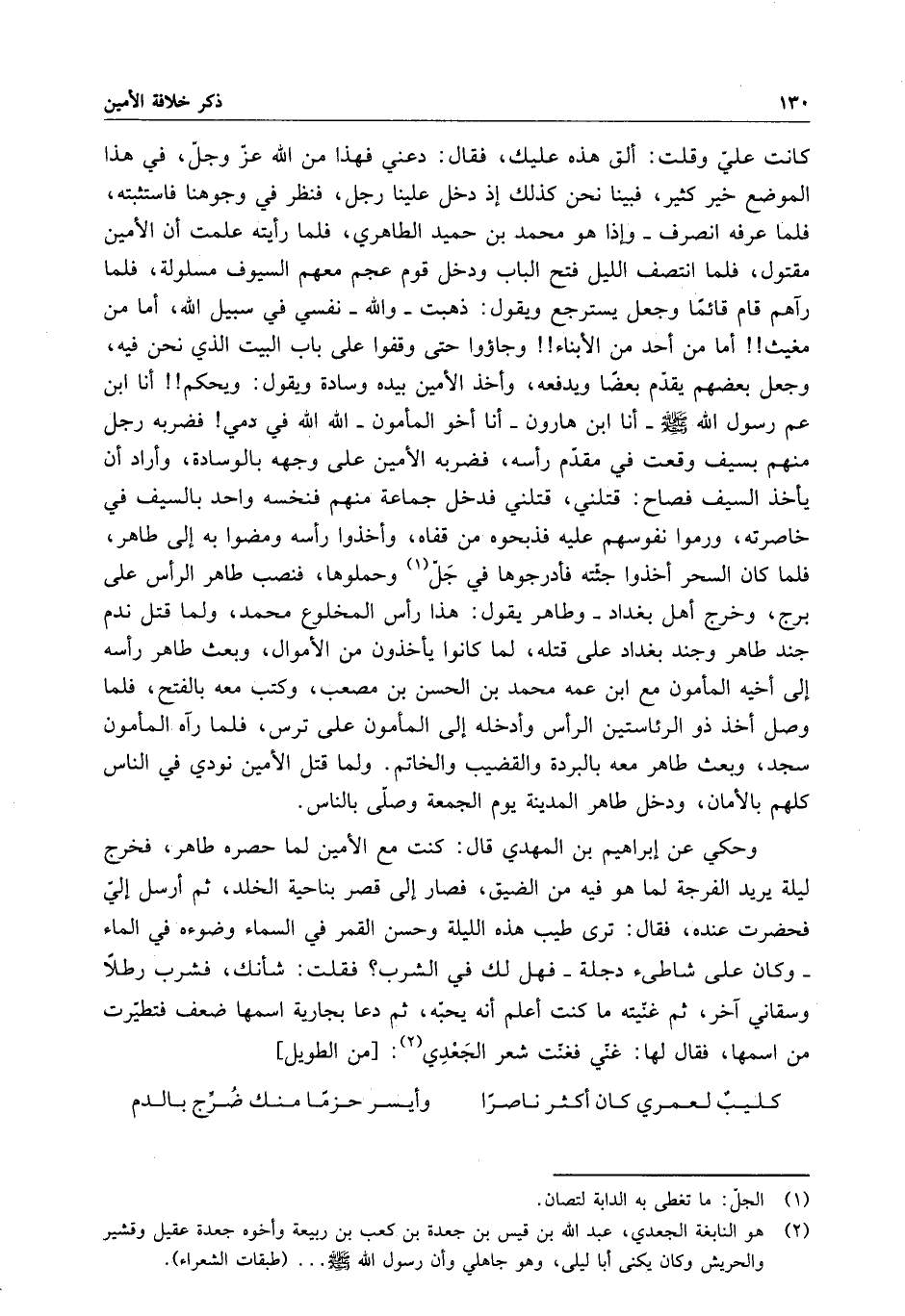 كانت علي وقلت : ألق هذه عليك ، فقال : دعني فهذا من الله عز وجل ، في هذا الموضع خير كثير ، فبينا نحن كذلك إذ دخل علينا رجل ، فنظر في وجوهنا فاستثبته ، فلما عرفه انصرف - وإذا هو محمد بن حميد الطاهري ، فلما رأيته علمت أن الأمين مقتول ، فلما انتصف الليل فتح الباب ودخل قوم عجم معهم السيوف مسلولة ، فلما رآهم قام قائماً وجعل يسترجع ويقول : ذهبت - والله - نفسي في سبيل الله ، أما من مغيث أما من أحد من الأبناء وجاءوا حتى وقفوا على باب البيت الذي نحن فيه ، وجعل بعضهم يقدم بعضاً ويدفعه ، وأخذ الأمين بيده وسادة ويقول : ويحكم أنا ابن عم رسول الله ( صلى الله عليه وسلم ) - أنا ابن هارون - أنا أخو المأمون - الله الله في دمي فضربه رجل منهم بسيف وقعت في مقدم رأسه ، فضربه الأمين على وجهه بالوسادة ، وأراد أن يأخذ السيف فصاح : قتلني ، قتلني فدخل جماعة منهم فنخسه واحد بالسيف في خاصرته ، ورموا نفوسهم عليه فذبحوه من قفاه ، وأخذوا رأسه ومضوا به إلى طاهر ، فلما كان السحر أخذوا جثته فأدرجوها في جل وحملوها ، فنصب طاهر الرأس على برج ، وخرج أهل بغداد - وطاهر يقول : هذا رأس المخلوع محمد ، ولما قتل ندم جند طاهر وجند بغداد على قتله ، لما كانوا يأخذون من الأموال ، وبعث طاهر رأسه إلى أخيه المأمون مع ابن عمه محمد بن الحسن بن مصعب ، وكتب معه بالفتح ، فلما وصل أخذ ذو الرئاستين الرأس وأدخله إلى المأمون على ترس ، فلما رآه المأمون سجد ، وبعث طاهر معه البردة والقضيب والخاتم . ولما قتل الأمين نودي في الناس كلهم بالأمان ، ودخل طاهر المدينة يوم الجمعة وصلى بالناس . البيت بواري وحصر مدرجة ووسادتان ، فلما ذهب من الليل ساعة وإذا الباب قد فتح ، وأدخل الأمين وهو عريان وعليه سراويل وعمامة ، وعلى كتفه خرقة خلقة ، فلما رأيته استرجعت وبكيت في نفسي ، فسألني عن اسمي فعرفته ، فقال : ضمني إليك فإني أجد وحشة شديدة ، قال : فضممته وإذا قلبه يخفق ، فقال : يا أحمد - ما فعل أخي ، قلت : حي ، قال : قبح الله بريدهم كان يقول قد مات - شبه المعتذر من محاربته ، فقلت : بل قبح الله وزراءك ، فقال : ما تراهم يصنعون بي ؟ أيقتلونني أم يفون بأيمانهم ؟ فقلت : يفون لك ، وجعل يضم الخرقة على كتفه ، فنزعت مبطنة كانت علي وقلت : ألق هذه عليك ، فقال : دعني فهذا من الله عز وجل ، في هذا الموضع خير كثير ، فبينا نحن كذلك إذ دخل علينا رجل ، فنظر في وجوهنا فاستثبته ، فلما عرفه انصرف - وإذا هو محمد بن حميد الطاهري ، فلما رأيته علمت أن الأمين مقتول ، فلما انتصف الليل فتح الباب ودخل قوم عجم معهم السيوف مسلولة ، فلما رآهم قام قائماً وجعل يسترجع ويقول : ذهبت - والله - نفسي في سبيل الله ، أما من مغيث أما من أحد من الأبناء وجاءوا حتى وقفوا على باب البيت الذي نحن فيه ، وجعل بعضهم يقدم بعضاً ويدفعه ، وأخذ الأمين بيده وسادة ويقول : ويحكم أنا ابن عم رسول الله ( صلى الله عليه وسلم ) - أنا ابن هارون - أنا أخو المأمون - الله الله في دمي فضربه رجل منهم بسيف وقعت في مقدم رأسه ، فضربه الأمين على وجهه بالوسادة ، وأراد أن يأخذ السيف فصاح : قتلني ، قتلني فدخل جماعة منهم فنخسه واحد بالسيف في خاصرته ، ورموا نفوسهم عليه فذبحوه من قفاه ، وأخذوا رأسه ومضوا به إلى طاهر ، فلما كان السحر أخذوا جثته فأدرجوها في جل وحملوها ، فنصب طاهر الرأس على برج ، وخرج أهل بغداد - وطاهر يقول : هذا رأس المخلوع محمد ، ولما قتل ندم جند طاهر وجند بغداد على قتله ، لما كانوا يأخذون من الأموال ، وبعث طاهر رأسه إلى أخيه المأمون مع ابن عمه محمد بن الحسن بن مصعب ، وكتب معه بالفتح ، فلما وصل أخذ ذو الرئاستين الرأس وأدخله إلى المأمون على ترس ، فلما رآه المأمون سجد ، وبعث طاهر معه البردة والقضيب والخاتم . ولما قتل الأمين نودي في الناس كلهم بالأمان ، ودخل طاهر المدينة يوم الجمعة وصلى بالناس . وحكى عن إبراهيم بن المهدي قال : كنت مع الأمين لما حصره طاهر ، فخرج ليلة يريد الفرجة لما هو فيه من الضيق ، فصار إلى قصر بناحية الخلد ، ثم أرسل إلي فحضرت عنده ، فقال : ترى طيب هذه الليلة وحس