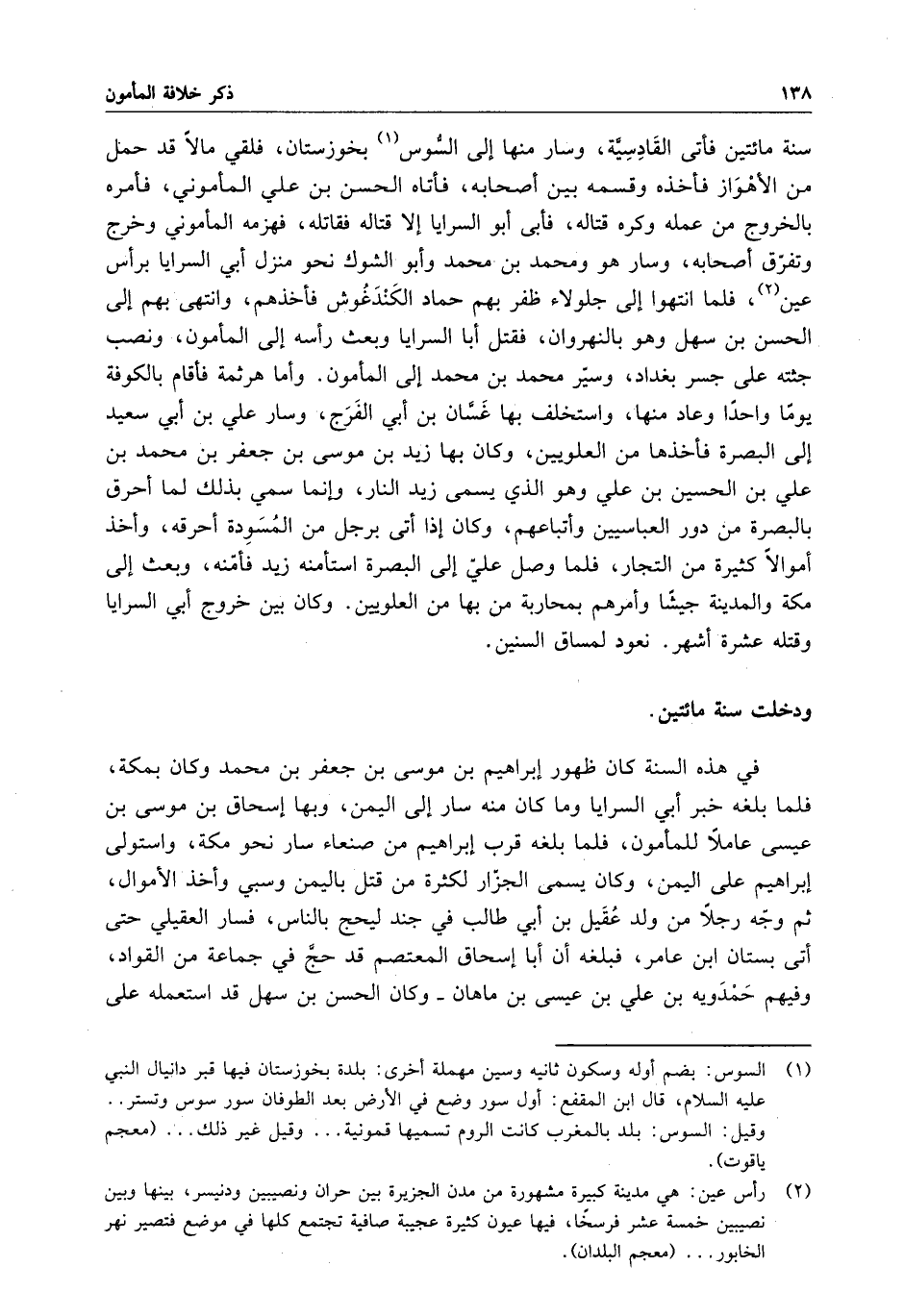 سنة مائتين فأتى القادسية ، وسار منها إلى السوس بخوزستان ، فلقي مالاً قد حمل من الأهواز فأخذه وقسمه بين أصحابه ، فأتاه الحسن بن علي المأموني ، فأمره بالخروج من عمله وكره قتاله ، فأبى أبو السرايا إلا قتاله فقاتله ، فهزمه المأموني وخرج وتفرق أصحابه ، وسار هو ومحمد بن محمد وأبو الشوك نحو منزل أبي السرايا برأس عين ، فلما انتهوا إلى جلولاء ظفر بهم حماد الكندغوش فأخذهم ، وانتهى بهم إلى الحسن بن سهل وهو بالنهروان . فقتل أبا السرايا وبعث رأسه إلى المأمون ، ونصب جثته على جسر بغداد . وسير محمد بن محمد إلى المأمون . وأما هرثمة فأقام بالكوفة يوماً واحداً وعاد منها ، واستخلف بها غسان بن أبي الفرج ، وسار علي بن أبي سعيد إلى البصرة فأخذها من العلويين ، وكان بها زيد بن موسى بن جعفر بن محمد بن علي بن الحسين بن علي وهو الذي يسمى زيد النار ، وإنما سمي بذلك لما أحرق بالبصرة من دور العباسيين وأتباعهم ، وكان إذا أتى برجل من المسودة أحرقه ، وأخذ أموالاً كثيرة من التجار ، فلما وصل علي إلى البصرة استأمنه زيد فأمنه ، وبعث إلى مكة والمدينة جيشاً وأمرهم بمحاربة من بها من العلويين . وكان بين خروج أبي السرايا وقتله عشرة أشهر . نعود لمساق السنين .