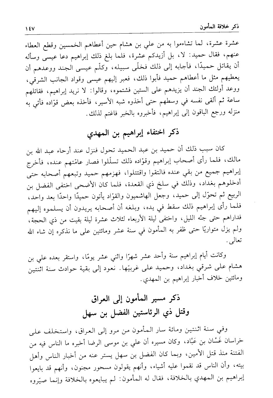 وكانت أيام إبراهيم سنة وأحد عشر شهراً واثني عشر يوماً ، واستقر بعده علي بن هشام على شرقي بغداد ، وحميد على غربيها . نعود إلى بقية حوادث سنة اثنتين ومائتين خلاف أخبار إبراهيم بن المهدي .