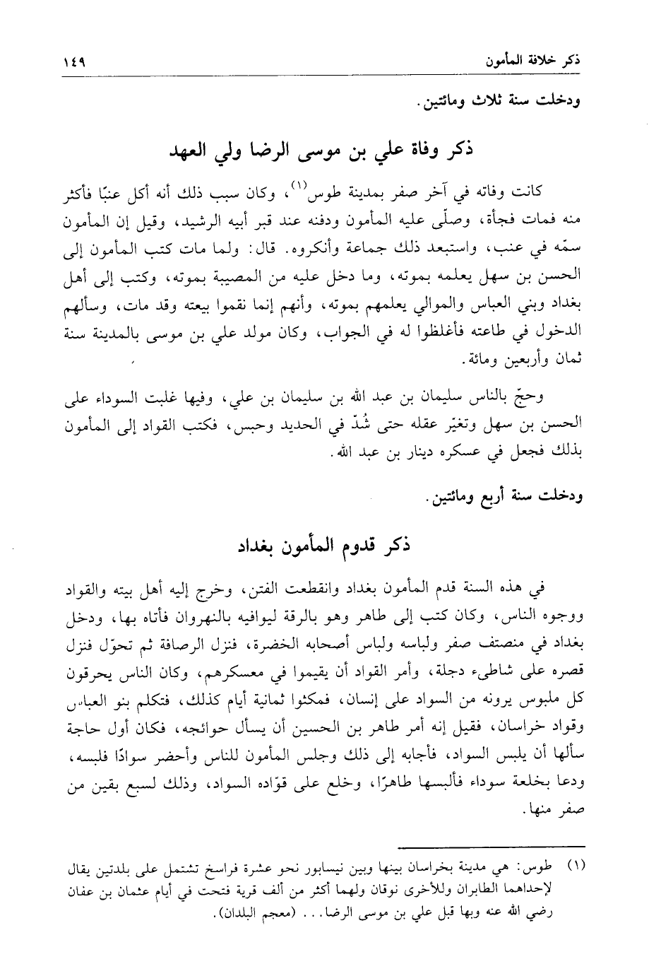 في هذه السنة قدم المأمون بغداد وانقطعت الفتن ، وخرج إليه أهل بيته والقواد ووجوه الناس ، وكان كتب إلى طاهر وهو بالرقة ليوافيه بالنهروان فأتاه بها ، ودخل بغداد في منتصف صفر ولباسه ولباس أصحابه الخضرة ، فنزل الرصافة ثم تحول فنزل قصره على شاطيء دجلة ، وأمر القواد أن يقيموا في معسكرهم ، وكان الناس يحرقون كل ملبوس يرونه من السواد على إنسان ، فمكثوا ثمانية أيام كذلك ، فتكلم بنو العباس وقواد خراسان ، فقيل إنه أمر طاهر بن الحسين أن يسأل حوائجه ، فكان أول حاجة سألها أن يلبس السواد ، فأجابه إلى ذلك وجلس المأمون للناس وأحضر سواداً فلبسه ، ودعا بخلعة سوداء فألبسها طاهراً ، وخلع على قواده السواد ، وذلك لسبع بقين من صفر منها .