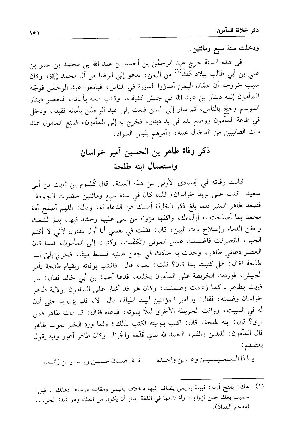 في هذه السنة خرج عبد الرحمن بن أحمد بن عبد الله بن محمد بن عمر بن علي بن أبي طالب ببلاد عك من اليمن ، يدعو إلى الرضا من آل محمد ( صلى الله عليه وسلم ) ، وكان سبب خروجه أن عمال اليمن أساءوا السيرة في الناس ، فبايعوا عبد الرحمن فوجه المأمون إليه دينار بن عبد الله في جيش كثيف ، وكتب معه بأمانه ، فحضر دينار الموسم وحج بالناس ، ثم سار إلى اليمن فبعث إلى عبد الرحمن بأمانه فقبله ، ودخل في طاعة المأمون ووضع يده في يد دينار ، فخرج به إلى المأمون ، فمنع المأمون عند ذلك الطالبيين من الدخول عليه ، وأمرهم بلبس السواد .