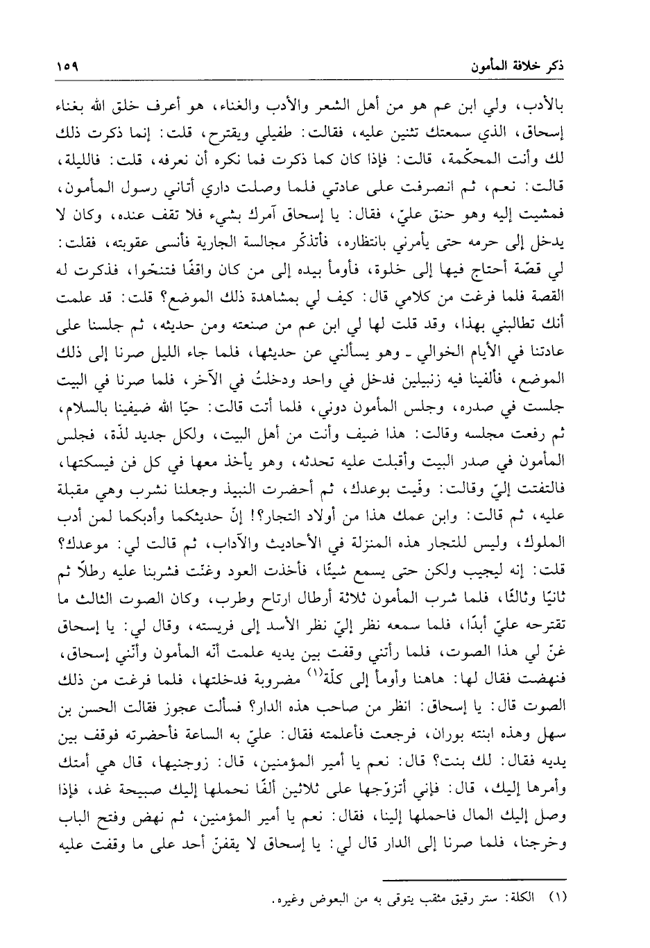 بالأدب ، ولي ابن عم هو من أهل الشعر والأدب والغناء ، هو أعرف خلق الله بغناء إسحاق ، الذي سمعتك تثنين عليه ، فقالت : طفيلي ويقترح ، قلت : إنما ذكرت ذلك لك وأنت المحكمة ، قالت : فإذا كان كما ذكرت فما نكره أن نعرفه ، قلت : فالليلة ، قالت : نعم ، ثم انصرفت على عادتي فلما وصلت داري أتاني رسول المأمون ، فمشيت إليه وهو حنق علي ، فقال : يا إسحاق آمرك بشيء فلا تقف عنده ، وكان لا يدخل إلى حرمه حتى يأمرني بانتظاره ، فأتذكر مجالسة الجارية فأنسى عقوبته ، فقلت : لي قصة أحتاج فيها إلى خلوة ، فأومأ بيده إلى من كان واقفاً فتنحوا ، فذكرت له القصة فلما فرغت من كلامي قال : كيف لي بمشاهدة ذلك الموضع ؟ قلت : قد علمت أنك تطالبني بهذا ، وقد قلت لها لي ابن عم من صنعته ومن حديثه ، ثم جلسنا على عادتنا في الأيام الخوالي - وهو يسألني عن حديثها ، فلما جاء الليل صرنا إلى ذلك الموضع ، فألفينا فيه زنبيلين فدخل في واحد ودخلت في الآخر ، فلما صرنا في البيت جلست في صدره ، وجلس المأمون دوني ، فلما أتت قالت : حيا الله ضيفينا بالسلام ، ثم رفعت مجلسه وقالت : هذا ضيف وأنت من أهل البيت ، ولكل جديد لذة ، فجلس المأمون في صدر البيت وأقبلت عليه تحدثه ، وهو يأخذ معها في كل فن فيسكتها ، فالتفتت إلي وقالت : وفيت بوعدك ، ثم أحضرت النبيذ وجعلنا نشرب وهي مقبلة عليه ، ثم قالت : وابن عمك هذا من أولاد التجار ؟ إن حديثكما وأدبكما لمن أدب الملوك ، وليس للتجار هذه المنزلة في الأحاديث والآداب ، ثم قالت لي : موعدك ؟ قلت : إنه ليجيب ولكن حتى يسمع شيئاً ، فأخذت العود وغنت فشربنا عليه رطلاً ثم ثانياً وثالثاً ، فلما شرب المأمون ثلاثة أرطال ارتاح وطرب ، وكان الصوت الثالث ما يقترحه علي أبداً ، فلما سمعه نظر إلي نظر الأسد إلى فريسته ، وقال لي : يا إسحاق غن لي هذا الصوت ، فلما رأتني وقفت بين يديه علمت أنه المأمون وأنني إسحاق ، فنهضت فقال لها : ها هنا وأومأ إلى كلة مضروبة فدخلتها ، فلما فرغت من ذلك الصوت قال : يا إسحاق : انظر من صاحب هذه الدار ؟ فسألت عجوز فقالت الحسن بن سهل وهذه ابنته بوران ، فرجعت فأعلمته فقال : علي به الساعة فأحضرته فوقف بين يديه فقال : لك بنت ؟ قال نعم يا أمير المؤمنين ، قال : زوجنيها ، قال هي أمتك وأمرها إليك ، قال : فإني أتزوجها على ثلاثين ألفاً نحملها إليك صبيحة غد ، فإذا وصل إليك المال فاحملها إلينا ، فقال : نعم يا أمير المؤمنين ، ثم نهض وفتح الباب وخرجنا ، فلما صرنا إلى الدار قال لي : يا إسحاق لا يقفن أحد على ما وقفت عليه