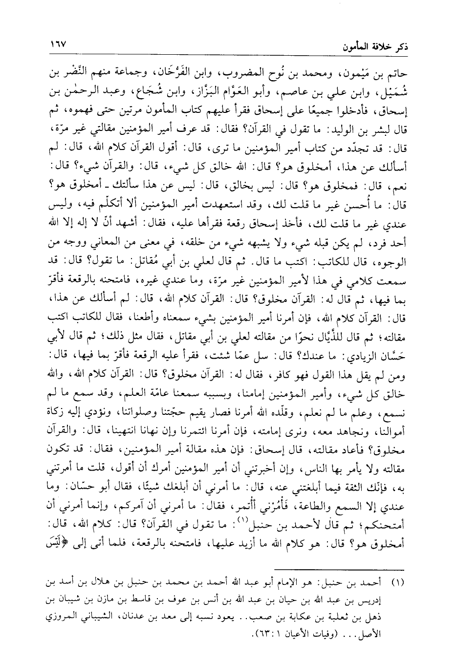 حاتم بن ميمون ، ومحمد بن نوح المضروب ، وابن الفرخان ، وجماعة منهم النضر بن شميل ، وابن علي بن عاصم ، وأبو العوام البزاز ، وابن شجاع ، وعبد الرحمن بن إسحاق ، فأدخلوه جميعاً على إسحاق فقرأ عليهم كتاب المأمون مرتين حتى فهموه ، ثم قال لبشر بن الوليد : ما تقول في القرآن ؟ فقال : قد عرف أمير المؤمنين مقالتي غير مرة ، قال : قد تجدد من كتاب أمير المؤمنين ما ترى ، قال : أقول القرآن كلام الله ، قال : لم أسألك عن هذا أمخلوق هو ؟ قال : الله خالق كل شيء ، قال : والقرآن شيء ؟ قال : نعم ، قال : فمخلوق هو ؟ قال : ليس بخالق ، قال : ليس عن هذا سألتك - أمخلوق هو ؟ قال : ما أحسن غير ما قلت لك ، وقد استعهدت أمير المؤمنين ألا أتكلم فيه ، وليس عندي غير ما قلت لك ، فأخذ إسحاق رقعة فقرأها عليه ، فقال : أشهد أن لا إله إلا الله أحد فرد ، لم يكن قبله شيء ولا يشبهه شيء من خلقه ، في معنى من المعاني ووجه من الوجوه ، قال للكاتب : اكتب ما قال . ثم قال لعلي بن أبي مقاتل : ما تقول ؟ قال : قد سمعت كلامي في هذا لأمير المؤمنين غير مرة ، وما عندي غيره ، فامتحنه بالرقعة فأقر بما فيها ، ثم قال له : القرآن مخلوق ؟ قال : القرآن كلام الله ، قال : لم أسألك عن هذا ، قال : القرآن كلام الله ، فإن أمرنا أمير المؤمنين بشيء سمعناه وأطعنا ، فقال للكاتب اكتب مقالته ، ثم قال للذيال نحواً من مقالته لعلي بن أبي مقاتل ، فقال مثل ذلك ، ثم قال لأبي حسان الزيادي : ما عندك ؟ قال : سل عما شئت ، فقرأ عليه الرقعة فأقر بما فيها ، قال : ومن لم يقل هذا القول فهو كافر ، فقال له : القرآن مخلوق ؟ قال : القرآن كلام الله ، والله خالق كل شيء ، وأمير المؤمنين إمامنا ، وبسببه سمعنا عامة العلم ، وقد سمع ما لم نسمع ، وعلم ما لم نعلم ، وقلده الله أمرنا فصار يقيم حجتنا وصلواتنا ، ونؤدي إليه زكاة أموالنا ، ونجاهد معه ، ونرى إمامته ، فإن أمرنا ائتمرنا وإن نهانا انتهينا ، قال : والقرآن مخلوق ؟ فأعاد مقالته ، قال إسحاق فإن هذا مقالة أمير المؤمنين ، فقال : قد تكون مقالته ولا يأمر بها الناس ، وإن أخبرتني أن أمير المؤمنين أمرك أن أبلغك شيئاً ، فقال أبو حسان : وما عندي إلا السمع والطاعة ، فأمرني أأتمر ، فقال : ما أمرني أن آمركم ، وإنما أمرني أن أمتحنكم ، ثم قال لأحمد بن حنبل : ما تقول في القرآن ؟ قال : كلام الله ، قال : أمخلوق هو ؟ قال : هو كلام الله ما أزيد عليها ، فامتحنه بالرقعة ، فلما أتى إلى " ليس