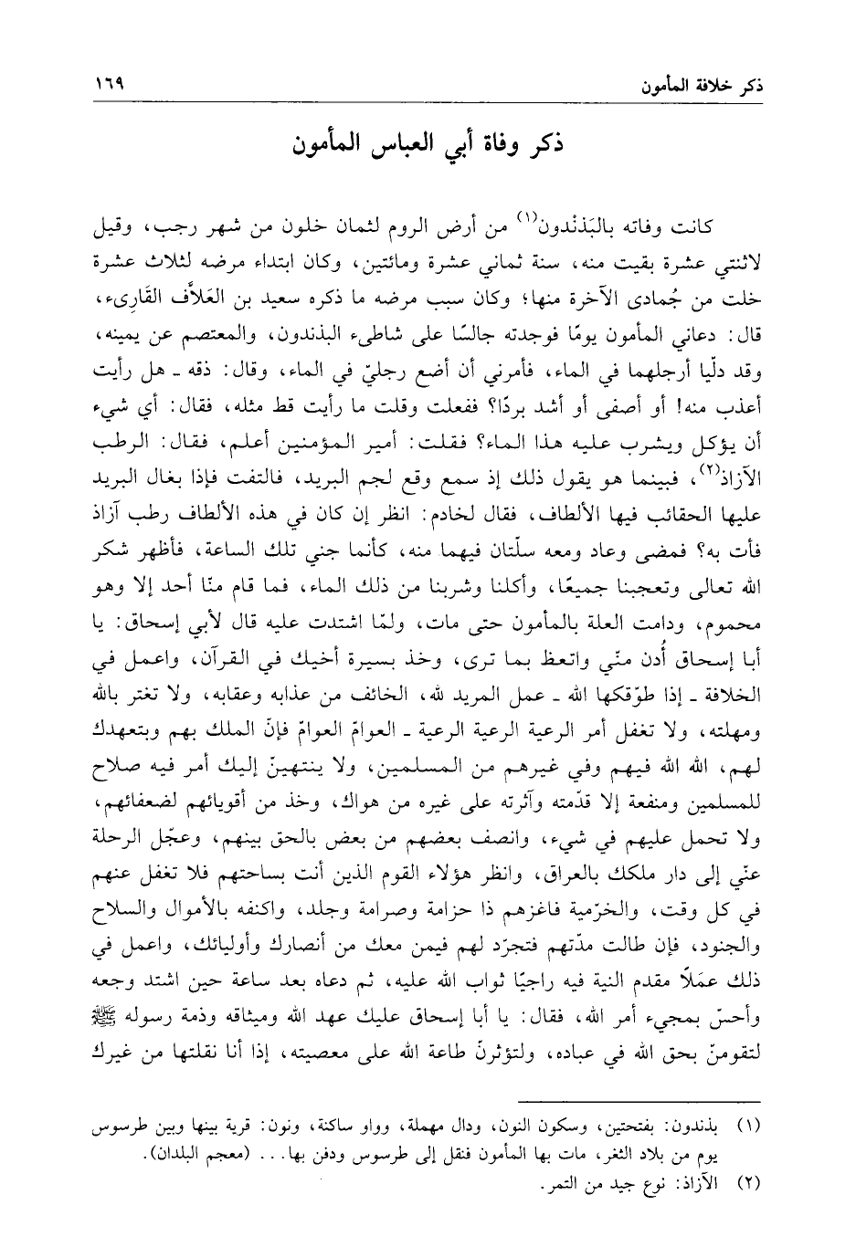 كانت وفاته بالبذندون من أرض الروم لثمان خلون من شهر رجب ، وقيل لاثنتي عشرة بقيت منه ، سنة ثماني عشرة ومائتين ، وكان ابتداء مرضه لثلاث عشرة خلت من جمادى الآخرة منها ، وكان سبب مرضه ما ذكره سعيد بن العلاف القاريء ، قال : دعاني المأمون يوماً فوجدته جالساً على شاطيء البذندون ، والمعتصم عن يمينه ، وقد دليا أرجلهما في الماء ، فأمرني أن أضع رجلي في الماء ، وقال : ذقه - هل رأيت أعذب منه أو أصفى أو أشد برداً ؟ ففعلت وقلت ما رأيت قط مثله ، فقال : أي شيء أن يؤكل ويشرب عليه هذا الماء ؟ فقلت : أمير المؤمنين أعلم ، فقال : الرطب الآزاذ ، فبينما هو يقول ذلك إذ سمع وقع لجم البريد ، فالتفت فإذا بغال البريد عليها الحقائب فيها الألطاف ، فقال لخادم : انظر إن كان في هذه الألطاف رطب آزاذ فأت به ؟ فمضى وعاد ومعه سلتان فيهما منه ، كأنما جني تلك الساعة ، فأظهر شكر الله تعالى وتعجبنا جميعاً ، وأكلنا وشربنا من ذلك الماء ، فما قام منا أحد إلا وهو محموم ، ودامت العلة بالمأمون حتى مات ، ولما اشتدت عليه قال لأبي إسحاق : يا أبا إسحاق أدن مني واتعظ بما ترى ، وخذ بسيرة أخيك في القرآن ، واعمل في الخلافة - إذا طوقكها الله - عمل المريد لله ، الخائف من عذابه وعقابه ، ولا تغتر بالله ومهلته ، ولا تغفل أمر الرعية الرعية الرعية - العوام العوام فإن الملك بهم وبتعهدك لهم ، الله الله فيهم وفي غيرهم من المسلمين ، ولا ينتهين إليك أمر فيه صلاح للمسلمين ومنفعة إلا قدمته وآثرته على غيره من هواك ، وخذ من أقويائهم لضعفائهم ، ولا تحمل عليهم في شيء ، وانصف بعضهم من بعض بالحق بينهم ، وعجل الرحلة عني إلى دار ملكك بالعراق ، وانظر هؤلاء القوم الذين أنت بساحتهم فلا تغفل عنهم في كل وقت ، والخرمية فاغزهم ذا حزامة وصرامة وجلد ، واكنفه بالأموال والسلاح والجنود ، فإن طالت مدتهم فتجرد لهم فيمن معك من أنصارك وأوليائك ، واعمل في ذلك عملاً مقدم النية فيه راجياً ثواب الله عليه ، ثم دعاه بعد ساعة حين اشتد وجعه وأحس بمجيء أمر الله ، فقال : يا أبا إسحاق عليك عهد الله وميثاقه وذمة رسوله ( صلى الله عليه وسلم ) لتقومن بحق الله في عباده ، ولتؤثرن طاعة الله على معصيته ، إذ أنا نقلتها من غيرك