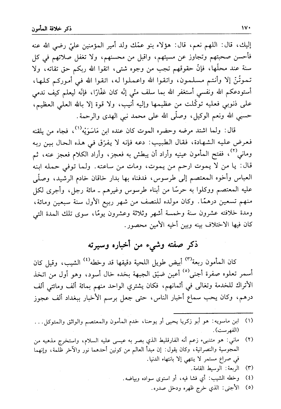 قال : ولما اشتد مرضه وحضره الموت كان عنده ابن ماسويه ، فجاء من يلقنه فعرض عليه الشهادة ، فقال الطبيب : دعه فإنه لا يفرق في هذه الحال بين ربه وماني ، ففتح المأمون عينيه وأراد أن يبطش به فعجز ، وأراد الكلام فعجز عنه ، ثم قال : يا من لا يموت ارحم من يموت ، ومات من ساعته . ولما توفي حمله ابنه العباس وأخوه المعتصم إلى طرسوس ، فدفناه بها بدار خاقان خادم الرشيد ، وصلى عليه المعتصم ووكلوا به حرساً من أبناء طرسوس وغيرهم - مائة رجل ، وأجرى لكل منهم تسعين درهماً . وكان مولده للنصف من شهر ربيع الأول سنة سبعين ومائة ، ومدة خلافته عشرون سنة وخمسة أشهر وثلاثة وعشرون يوماً ، سوى تلك المدة التي كان فيها الاختلاف بينه وبين أخيه الأمين محصور .