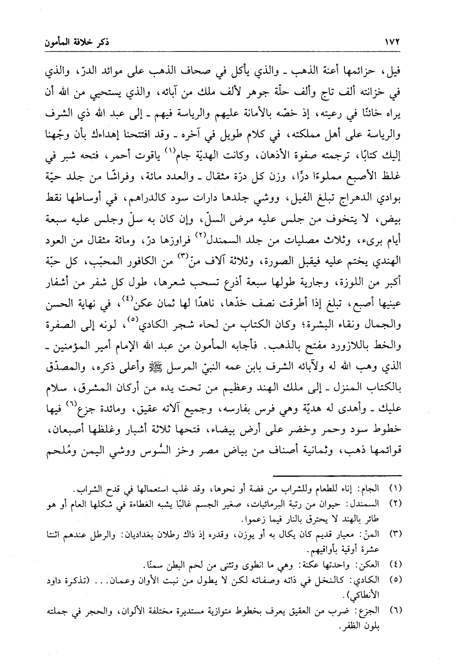 فيل ، حزائمها أعنة الذهب - والذي يأكل في صحاف الذهب على موائد الدر ، والذي في خزانته ألف تاج وألف حلة جوهر لألف ملك من آبائه ، والذي يستحيي من الله أن يراه خائناً في رعيته ، إذ خصه بالأمانة عليهم والرياسة فيهم - إلى عبد الله ذي الشرف والرياسة على أهل مملكته ، في كلام طويل في آخره - وقد افتتحنا إهدائك بأن وجهنا إليك كتاباً ، ترجمته صفوة الأذهان ، وكانت الهدية جم ياقوت أحمر ، فتحه شبر في غلظ الأصبع مملوءًا دراً ، وزن كل درة مثقال - والعدد مائة ، وفراشاً من جلد حية بوادي الدهراج تبلغ الفيل ، ووشي جلدها دارات سود كالدراهم ، في أوساطها نقط بيض ، لا يتخوف من جلس عليه مرض السل ، وإن كان به سل وجلس عليه سبعة أيام بريء ، وثلاث مصليات من جلد السمندل فراوزها در ، ومائة مثقال من العود الهندي يختم عليه فيقبل الصورة ، وثلاثة آلاف منّ من الكافور المحبب ، كل حبة أكبر من اللوزة ، وجارية طولها سبعة أذرع تسحب شعرها ، طول كل شفر من أشفار عينيها أصبع ، تبلغ إذا أطرقت نصف خدها ، ناهداً لها ثمان عكن ، في نهاية الحسن والجمال ونقاء البشرة ، وكان الكتاب من لحاء شجر الكادي ، لونه إلى الصفرة والخط باللازورد مفتح بالذهب . فأجابه المأمون من عبد الله الإمام أمير المؤمنين - الذي وهب الله له ولآبائه الشرف بابن عمه النبي المرسل ( صلى الله عليه وسلم ) وأعلى ذكره ، والمصدق بالكتاب المنزل - إلى ملك الهند وعظيم من تحت يده من أركان المشرق ، سلام عليك - وأهدى له هدية وهي فرس بفارسه ، وجميع ما آلاته عقيق ، ومائدة جزع فيها خطوط سود وحمر وخضر على أرض بيضاء ، فتحها ثلاثة أشبار وغلظها أصبعان ، قوائمها ذهب ، وثمانية أصناف من بياض مصر وخز السوس ووشي اليمن وملحم