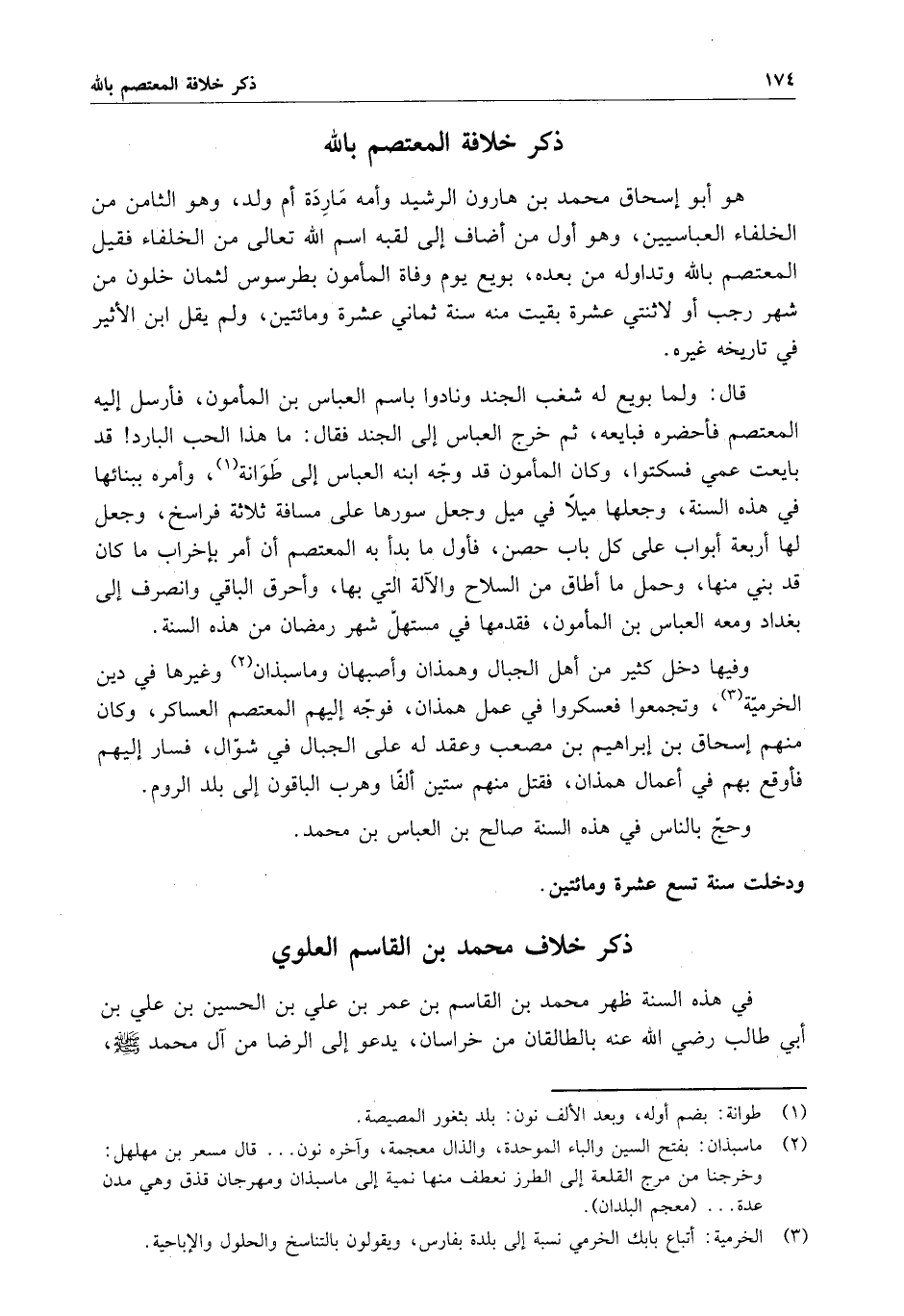 قال : ولما بويع له شغب الجند ونادوا باسم العباس بن المأمون فأرسل إليه المعتصم فأحضره فبايعه ، ثم خرج العباس إلى الجند فقال : ما هذا الحب البارد قد بايعت عمي فسكتوا ، وكان المأمون قد وجه ابنه العباس إلى طوانة ، وأمره ببنائها في هذه السنة ، وجعلها ميلاً في ميل وجعل سورها على مسافة ثلاثة فراسخ ، وجعل لها أربعة أبواب على كل باب حصن ، فأول ما بدأ به المعتصم أن أمر بإخراب ما كان قد بنى منها ، وحمل ما أطاق من السلاح والآلة التي بها ، وأحرق الباقي وانصرف إلى بغداد ومعه العباس بن المأمون ، فقدمها في مستهل شهر رمضان من هذه السنة .
