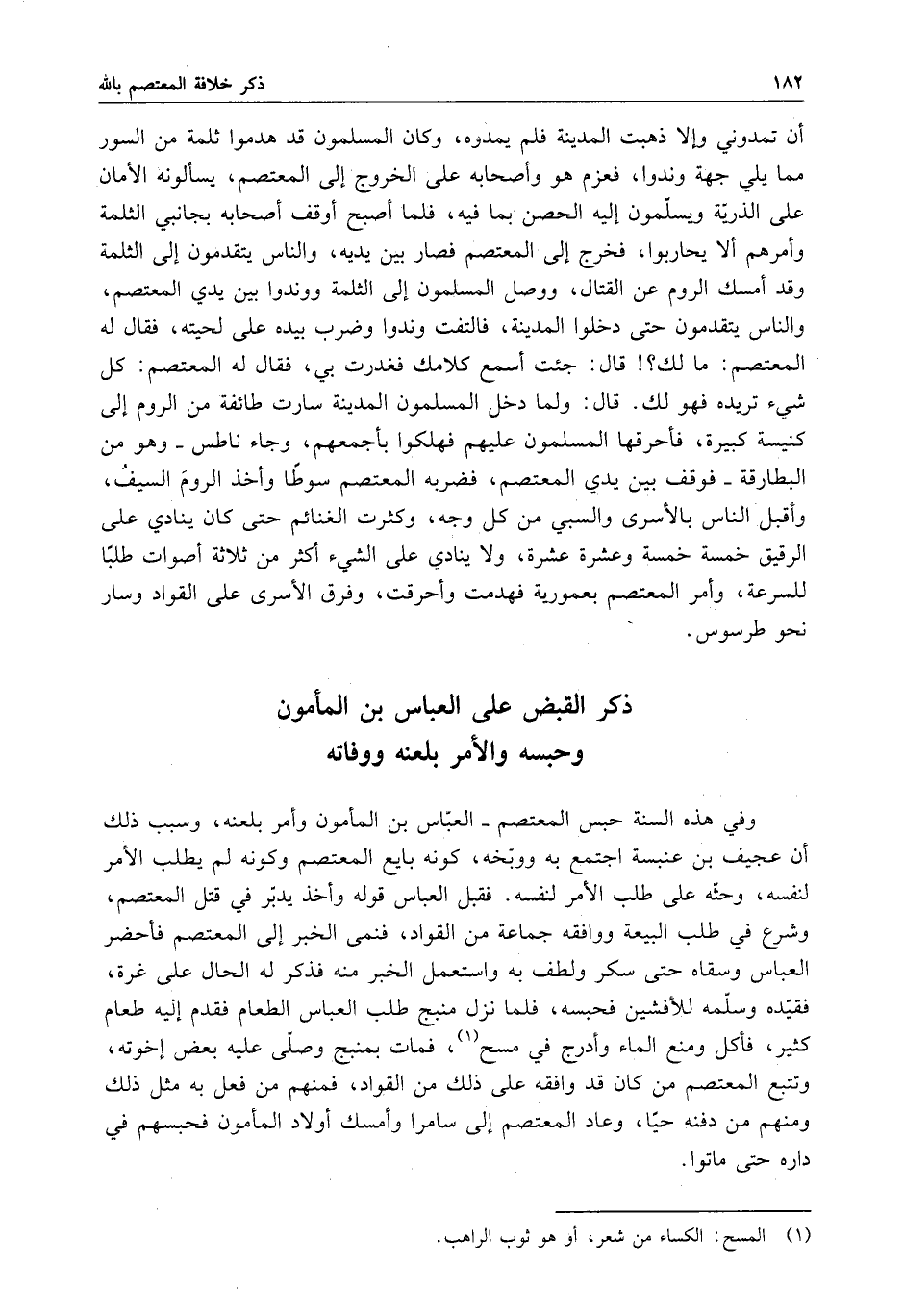 أن تمدوني وإلا ذهبت المدينة فلم يمدوه ، وكان المسلمون قد هدموا ثلمة من السور مما يلي جهة وندوا ، فعزم هو وأصحابه على الخروج إلى المعتصم ، يسألونه الأمان على الذرية ويسلمون إليه الحصن بما فيه ، فلما أصبح أوقف أصحابه بجانبي الثلمة وأمرهم ألا يحاربوا ، فخرج إلى المعتصم فصار بين يديه ، والناس يتقدمون إلى الثلمة وقد أمسك الروم عن القتال ، ووصل المسلمون إلى الثلمة ووندوا بين يدي المعتصم ، والناس يتقدمون حتى دخلوا المدينة ، فالتفت وندوا وضرب بيده على لحيته ، فقال له المعتصم : مالك ؟ قال : جئت أسمع كلامك فغدرت بي ، فقال له المعتصم : كل شيء تريده فهو لك . قال : ولما دخل المسلمون المدينة صارت طائفة من الروم إلى كنيسة كبيرة ، فأحرقها المسلمون عليهم فهلكوا بأجمعهم ، وجاء ناطس - وهو من البطارقة - فوقف بين يدي المعتصم ، فضربه المعتصم سوطاً وأخذ الروم السيف ، وأقبل الناس بالأسرى والسبي من كل وجه ، وكثرت الغنائم حتى كان ينادى الرقيق خمسة خمسة وعشرة عشرة ، لا ينادى على الشيء أكثر من ثلاث أصوات طلباً للسرعة ، وأمر المعتصم بعمورية فهدمت وأحرقت ، وفرق الأسرى على القواد وسار نحو طرسوس .