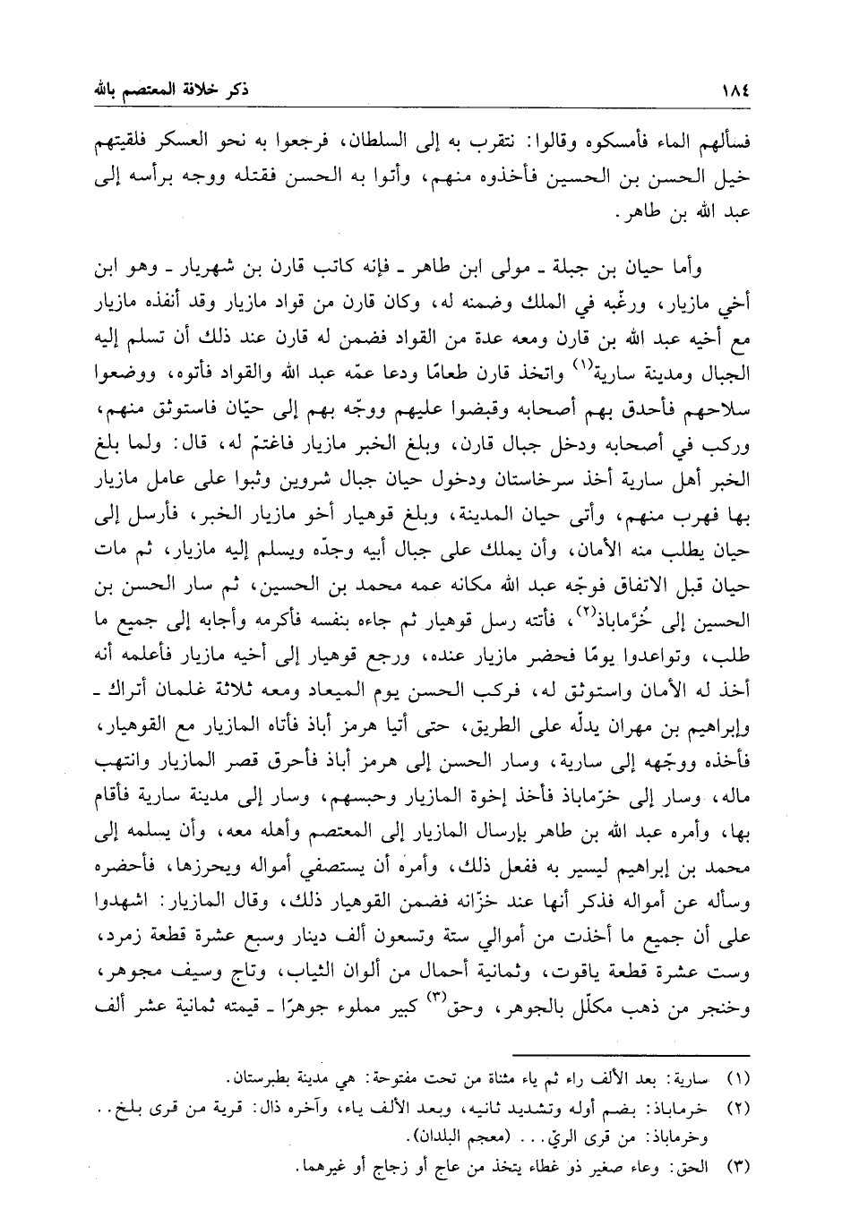 فسألهم الماء فأمسكوه وقالوا : نتقرب به إلى السلطان ، فرجعوا به نحو العسكر فلقيتهم خيل الحسن بن الحسين فأخذوه منهم ، وأتوا به الحسن فقتله ووجه برأسه إلى عبد الله بن طاهر . وأما حيان بن جبلة - مولى ابن طاهر - فإنه كاتب قارن بن شهريار - وهو ابن أخي مازيار ، ورغبه في الملك وضمنه له ، وكان قارن من قواد مازيار وقد أنفذه مازيار مع أخيه عبد الله بن قارن ومعه عدة من القواد فضمن له قارن عند ذلك أن تسلم إليه الجبال ومدينة سارية واتخذ قارن طعاماً ودعا عمه عبد الله والقواد فأتوه ، ووضعوا سلاحهم فأحدق بهم أصحابه وقبضوا عليهم ووجه بهم إلى حيان فاستوثق منهم ، وركب في أصحابه ودخل جبال قارن ، وبلغ الخبر مازيار فاغتم له ، قال : ولما بلغ الخبر أهل سارية أخذ سرخاستان ودخول حيان جبال شروين وثبوا على عامل مازيار بها فهرب منهم ، وأتى حيان المدينة ، وبلغ قوهيار أخو مازيار الخبر ، فأرسل إلى حيان يطلب منه الأمان ، وأن يملك على جبال أبيه وجده ويسلم إليه مازيار ، ثم مات حيان قبل الاتفاق فوجه عبد الله مكانه عمه محمد بن الحسين ، ثم صار الحسن بن الحسين إلى خرماباذ ، فأتته رسل قوهيار ثم جاءه بنفسه فأكرمه وأجابه إلى جميع ما طلب ، وتواعدوا يوماً فحضر مازيار عنده ، ورجع قوهيار إلى أخيه مازيار فأعلمه أنه أخذ له الأمان واستوثق له ، فركب الحسن يوم الميعاد ومعه ثلاثة غلمان أتراك - وإبراهيم بن مهران يدله على الطريق ، حتى أتيا هرمز أباذ فأتاه المازيار مع القوهيار ، فأخذه ووجهه إلى سارية ، وسار الحسن إلى هرمز أباذ فأحرق قصر المازيار وانتهب ماله ، وسار إلى خرماباذ إخوة المازيار وحبسهم ، وسار إلى مدينة سارية فأقام بها ، وأمره عبد الله بن طاهر بإرسال المازيار إلى المعتصم وأهله معه ، وأن يسلمه إلى محمد بن إبراهيم ليسير به ففعل ذلك ، وأمره أن يستصفي أمواله ويحرزها ، فأحضره وسأله عن أمواله فذكر أنها عند خزانة فضمن القوهيار ذلك ، وقال المازيار : اشهدوا على أن جميع ما أخذت من أموالي ستة وتسعون ألف دينار وسبع عشرة قطعة زمرد ، وست عشرة قطعة ياقوت ، وثمانية أحمال من ألوان الثياب ، وتاج وسيف مجوهر ، وخنجر من ذهب مكلل بالجوهر ، وحق كبير مملوء جوهراً - قيمته ثمانية عشر ألف