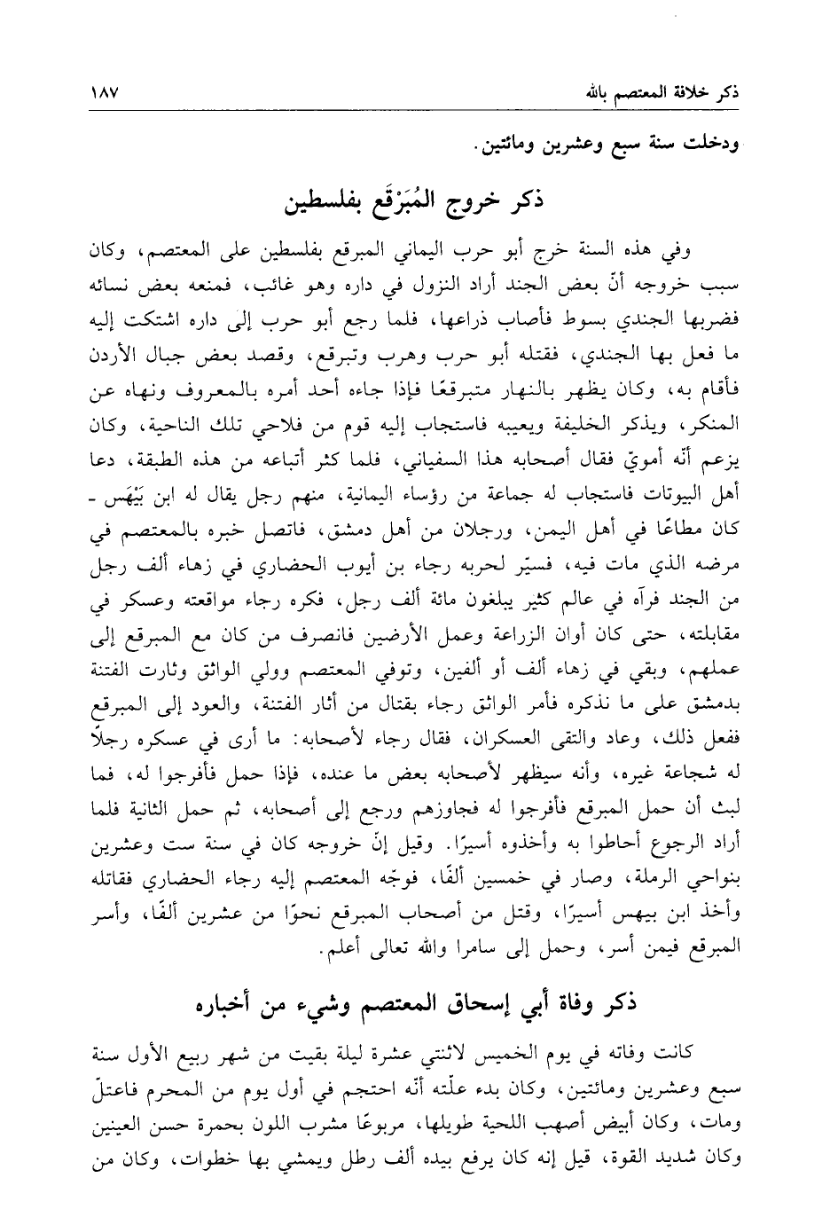 وفي هذه السنة خرج أبو حرب اليماني المبرقع بفلسطين على المعتصم ، وكان سبب خروجه أن بعض الجند أراد النزول في داره وهو غائب ، فمنعه بعض نسائه فضربها الجندي بسوط فأصاب ذراعها ، فلما رجع أبو حرب إلى داره اشتكت إليه ما فعل بها الجندي ، فقتله أبو حرب وهرب وتبرقع ، وقصد بعض جبال الأردن فأقام به ، وكان يظهر بالنهار متبرقعاً فإذا جاءه أحد أمره بالمعروف ونهاه عن المنكر ، ويذكر الخليفة ويعيبه فاستجاب إليه قوم من فلاحي تلك الناحية ، وكان يزعم أنه أموي فقال أصحابه هذا السفياني ، فلما كثر أتباعه من هذه الطبقة ، دعا أهل البيوتات فاستجاب له جماعة من رؤساء اليمانية ، منهم رجل يقال له ابن بيهس - كان مطاعاً في أهل اليمن ، ورجلان من أهل دمشق ، فاتصل خبره بالمعتصم في مرضه الذي مات فيه ، فسير لحربه رجاء بن أيوب الحضاري في زهاء ألف رجل من الجند فرآه في عالم كثير يبلغون مائة ألف رجل ، فكره رجاء مواقعته وعسكر في مقابلته ، حتى كان أوان الزراعة وعمل الأرضين فانصرف من كان مع المبرقع إلى عملهم ، وبقي في زهاء ألف أو ألفين ، وتوفي المعتصم وولي الواثق وثارت الفتنة بدمشق على ما نذكره فأمر الواثق رجاء بقتال من أثار الفتنة ، والعود إلى المبرقع ففعل ذلك ، وعاد والتقى العسكران ، فقال رجاء لأصحابه : ما أرى في عسكره رجلاً له شجاعة غيره ، وأنه سيظهر لأصحابه بعض ما عنده ، فإذا حمل فأفرجوا له ، فما لبث أن حمل المبرقع فأفرجوا له فجاوزهم ورجع إلى أصحابه ، ثم حمل الثانية فلما أراد الرجوع أحاطوا به وأخذوه أسيراً . وقيل إن خروجه كان في سنة ست وعشرين بنواحي الرملة ، وصار في خمسين ألفاً ، فوجه المعتصم إليه رجاء الحضاري فقاتله وأخذ ابن بيهس أسيراً ، وقتل من أصحاب المبرقع نحواً من عشرين ألفاً ، وأسر المبرقع فيمن أسر ، وحمل إلى سامرا والله تعالى أعلم .