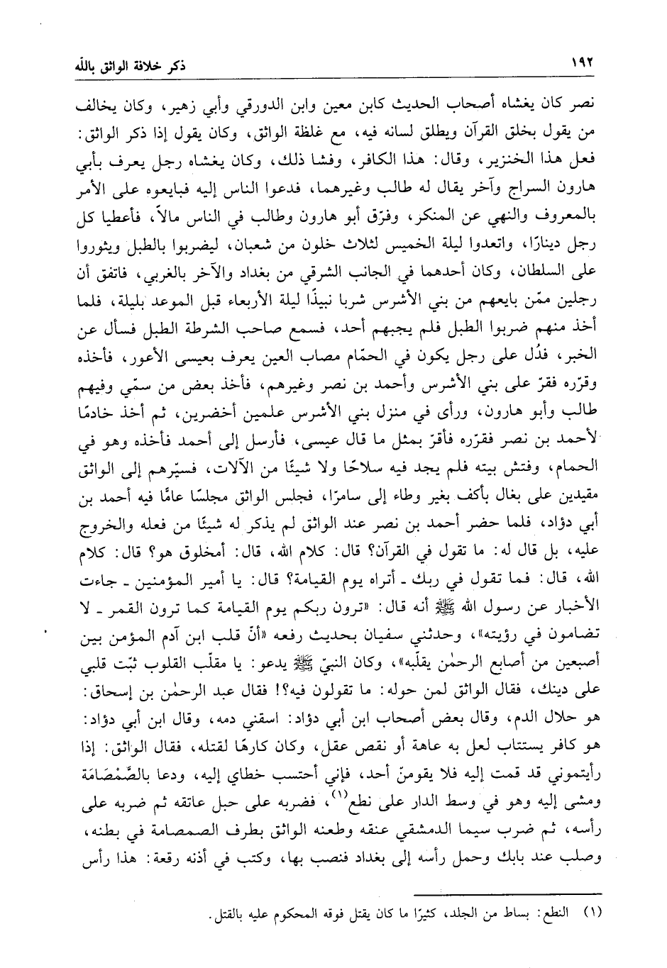 نصر كان يغشاه أصحاب الحديث كابن معين وابن الدورقي وأبي زهير ، وكان يخالف من يقول بخلق القرآن ويطلق لسانه فيه ، مع غلظة الواثق ، وكان يقول إذا ذكر الواثق : فعل هذا الخنزير ، وقال : هذا الكافر ، وفشا ذلك ، وكان يغشاه رجل يعرف بأبي هارون السراج وآخر يقال له طالب وغيرهما ، فدعوا الناس إليه فبايعوه على الأمر بالمعروف والنهي عن المنكر ، وفرق أبو هارون وطالب في الناس مالاً ، فأعطيا كل رجل ديناراً ، واتعدوا ليلة الخميس لثلاث خلون من شعبان ، ليضربوا بالطبل ويثوروا على السلطان ، وكان أحدهما في الجانب الشرقي من بغداد والآخر بالغربي ، فاتفق أن رجلين ممن بايعهم من بني الأشرس شربا نبيذاً ليلة الأربعاء قبل الموعد بليلة ، فلما أخذ منهم ضربوا الطبل فلم يجبهم أحد ، فسمع صاحب الشرطة الطبل فسأل عن الخبر ، فدل على رجل يكون في الحمام مصاب العين يعرف بعيسى الأعور ، فأخذه وقرره فقر على بني الأشرس وأحمد بن نصر وغيرهم ، فأخذ بعض من سمى وفيهم طالب وأبو هارون ، ورأى في منزل بني الأشرس علمين أخضرين ، ثم أخذ خادماً لأحمد بن نصر فقرره فأقر بمثل ما قال عيسى ، فأرسل إلى أحمد فأخذه وهو في الحمام ، وفتش بيته فلم يجد فيه سلاحاً ولا شيئاً من الآلات ، فسيرهم إلى الواثق مقيدين على بغال بأكف بغير وطاء إلى سامرا ، فجلس الواثق مجلساً عاماً فيه أحمد بن أبي دؤاد ، فلما حضر أحمد بن نصر عند الواثق لم يذكر له شيئاً من فعله والخروج عليه ، بل قال له : ما تقول في القرآن ؟ قال : كلام الله ، قال : أمخلوق هو ؟ قال : كلام الله ، قال : فما تقول في ربك - أتراه يوم القيامة ؟ قال : يا أمير المؤمنين - جاءت الأخبار عن رسول الله ( صلى الله عليه وسلم ) أنه قال " ترون ربكم يوم القيامة كما ترون القمر - لا تضامون في رؤيته " ، وحدثني سفيان بحديث رفعه " أن قلب ابن آدم المؤمن بين أصبعين من أصابع الرحمن يقلبه " ، وكان النبي ( صلى الله عليه وسلم ) يدعو : يا مقلب القلوب ثبت قلبي على دينك ، فقال الواثق لمن حوله : ما تقولون فيه ؟ فقال عبد الرحمن بن إسحاق : هو حلال الدم ، وقال بعض أصحاب ابن أبي دؤاد : اسقني دمه ، وقال ابن أبي دؤاد : هو كافر يستتاب لعل به عاهة أو نقص عقل ، وكان كارهاً لقتله ، فقال الواثق : إذا رأيتموني قد قمت إليه فلا يقومن أحد ، فإني أحتسب خطاي إليه ، ودعا بالصمصامة ومشى إليه وهو في وسط الدار على نطع ، فضربه على حبل عاتقه ثم ضربه على رأسه ، ثم ضرب سيما الدمشقي عنقه وطعنه الواثق بطرف الصمصامة في بطنه ، وصلب عند بابك وحمل رأسه إلى بغداد فنصب بها ، وكتب في أذنه رقعة : هذا رأس