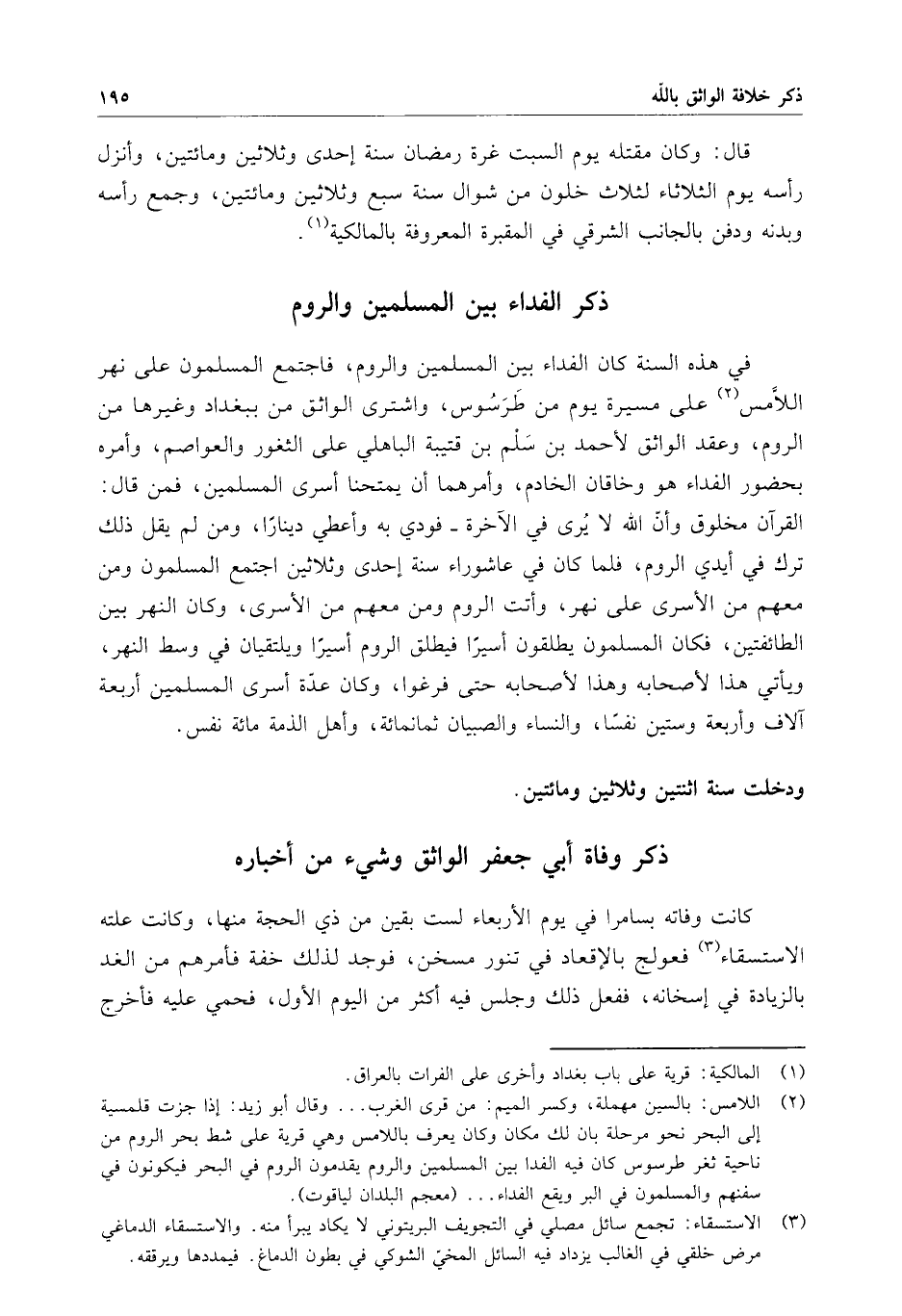 في هذه السنة كان الفداء بين المسلمين والروم ، فاجتمع المسلمون على نهر اللامس على مسيرة يوم من طرسوس ، واشترى الواثق من ببغداد وغيرها من الروم ، وعقد الواثق لأحمد بن سلم بن قتيبة الباهلي على الثغور والعواصم ، وأمره بحضور الفداء هو وخاقان الخادم ، وأمرهما أن يمتحنا أسرى المسلمين ، فمن قال : القرآن مخلوق وأن الله لا يرى في الآخرة - فودي به وأعطي ديناراً ، ومن لم يقل ذلك ترك في أيدي الروم ، فلما كان في عاشوراء سنة إحدى وثلاثين اجتمع المسلمون ومن معهم من الأسرى على نهر ، وأتت الروم ومن معهم من الأسرى ، وكان النهر بين الطائفتين ، فكان المسلمون يطلقون أسيراً فيطلق الروم أسيراً ويلتقيان في وسط النهر ، ويأتي هذا لأصحابه وهذا لأصحابه حتى فرغوا ، وكان عدة أسرى المسلمين أربعة آلاف وأربعة وستين نفساً ، والنساء والصبيان ثمانمائة ، وأهل الذمة مائة نفس .