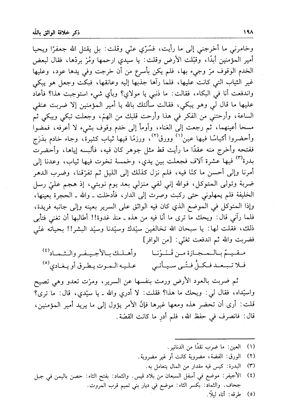 وخامرني ما أخرجني إلى ما رأيت ، فسري عني وقلت : بل يقتل الله جعفراً ويحيا أمير المؤمنين أبداً ، وقبلت الأرض وقلت : يا سيدي إرحمها ومر بردها ، فقال لبعض الخدم الوقوف مر وجيء بها ، فلم يكن بأسرع من أن خرجت وفي يدها عود ، وعليها غير الثياب التي كانت عليها ، فلما رآها جذبها إليه وعانقها ، فبكت وجعل هو يبكي واندفعت أنا في البكاء ، فقالت : ما ذنبي يا مولاي ؟ وبأي شيء استوجبت هذا ؟ فأعاد عليها ما قال لي وهو يبكي ، فقالت سألتك بالله يا أمير المؤمنين إلا ضربت عنقي الساعة ، وأرحتني من الفكر في هذا وأرحت قلبك من الهم ، وجعلت تبكي ويبكي ثم مسحا أعينهما ، ثم رجعت إلى الغناء ، وأومأ إلى خدم وقوف بشيء لا أعرفه ، فمضوا وأحضروا أكياساً فيها عين وورق ، ورزماً فيها ثياب كثيرة ، وجاء خادم بدرج ففتحه وأخرج منه عقداً ما رأيت مثل جوهر كان فيه ، فألبسه إياها ، وأحضرت بدرة فيها عشرة آلاف فجعلت بين يدي ، وخمسة تخوت فيها ثياب ، وعدنا إلى أمرنا إلى أحسن ما كنا فيه ، فلم نزل كذلك إلى الليل ثم تفرقنا ، وضرب الدهر ضربة وتولى المتوكل ، فوالله إني لفي منزلي بعد يوم نوبتي ، إذ هجم علي رسل الخليفة فلم يمهلوني حتى ركبت وصرت إلى الدار ، فأدخلت - والله - الحجرة بعينها ، وإذا المتوكل في الموضع الذي كان فيه الواثق على السرير بعينه وإلى جانبه فريدة ، فلما رآني قال : ويحك ما ترى ما أنا فيه من هذه - منذ غدوة أطالبها أن تغني فتأبى ذلك ، فقلت لها : يا سبحان الله تخالفين سيدك وسيدنا وسيد البشر بحياته غني فضربت والله ثم اندفعت تغني :