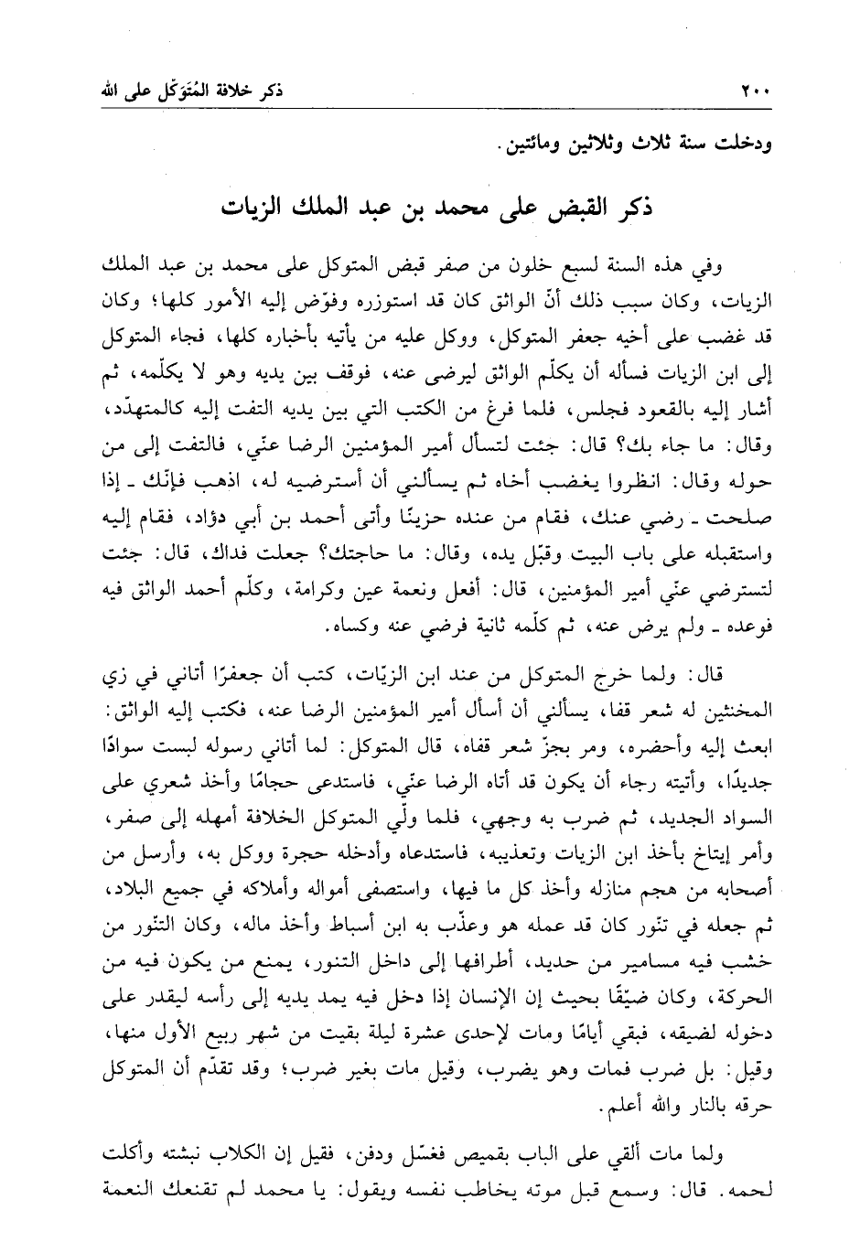 قال : ولما خرج المتوكل من عند ابن الزيات ، كتب أن جعفراً أتاني في زي المخنثين له شعرقفا ، يسألني أن أسأل أمير المؤمنين الرضا عنه ، فكتب إليه الواثق : ابعث إليه وأحضره ، ومر بجز شعر قفاه ، قال المتوكل : لما أتاني رسوله لبست سواداً جديداً ، وأتيته رجاء أن يكون قد أتاه الرضا عني ، فاستدعى حجاماً وأخذ شعري على السواد الجديد ، ثم ضرب به وجهي ، فلما ولي المتوكل الخلافة أمهله إلى صفر ، وأمر إيتاخ بأخذ ابن الزيات وتعذيبه ، فاستدعاه وأدخله حجرة ووكل به ، وأرسل من أصحابه من هجم منازله وأخذ كل ما فيها ، واستصفى أمواله وأملاكه في جميع البلاد ، ثم جعله في تنور كان قد عمله هو وعذب به ابن أسباط وأخذ ماله ، وكان التنور من خشب فيه مسامير من حديد ، أطرافها إلى داخل التنور ، يمنع من يكون فيه من الحركة ، وكان ضيقاً بحيث إن الإنسان إذا دخل فيه يمد يديه إلى رأسه ليقدر على دخوله لضيقه ، فبقي أياماً ومات لإحدي عشرة ليلة بقيت من شهر ربيع الأول منها ، وقيل : بل ضرب فمات وهو يضرب ، وقيل مات بغير ضرب ، وقد تقدم أن المتوكل حرقه بالنار والله أعلم .
