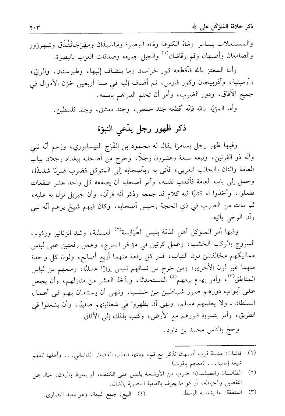 وفيها ظهر رجل بسامرا يقال له محمود بن الفرج النيسابوري ، وزعم أنه نبي وأنه ذو القرنين ، وتبعه سبعة وعشرون رجلاً ، وخرج من أصحابه ببغداد رجلان بباب العامة واثنان بالجانب الغربي ، فأتى به وبأصحابه إلى المتوكل فضرب ضرباً شديداً ، وحمل إلى باب العامة فأكذب نفسه ، وأمر أصحابه أن يصفعه كل واحد عشر صفعات ففعلوا ، وأخذوا له كتاباً فيه كلام قد جمعه وذكر أنه قرآن ، وأن جبريل نزل به عليه ، ثم مات من الضرب في ذى الحجة وحبس أصحابه ، وكان فيهم شيخ يزعم أنه نبي وأن الوحي يأتيه . وفيها أمر المتوكل أهل الذمة بلبس الطيالسة العسلية ، وشد الزنانير وركوب السروج بالركب الخشب ، وعمل كرتين في مؤخر السرج ، وعمل رقعتين على لباس مماليكهم مخالفتين لون الثياب ، قدر كل رقعة منهما أربع أصابع ، ولون كل واحدة منهما غير لون الأخرى ، ومن خرج من نسائهم تلبس إزاراً عسلياً ، ومنعهم من لباس المناطق ، وأمر بهدم بيعهم المستحدثة ، وبأخذ العشر من منازلهم ، وأن يجعل على أبواب دورهم صور شياطين من خشب ، ونهى أن يستعان بهم في أعمال السلطان - ولا يعلمهم مسلم ، ونهى أن يظهروا في شعانينهم صليباً ، وأن يشعلوا في الطريق ، وأمر بتسوية قبورهم مع الأرض ، وكتب بذلك إلى الآفاق .
