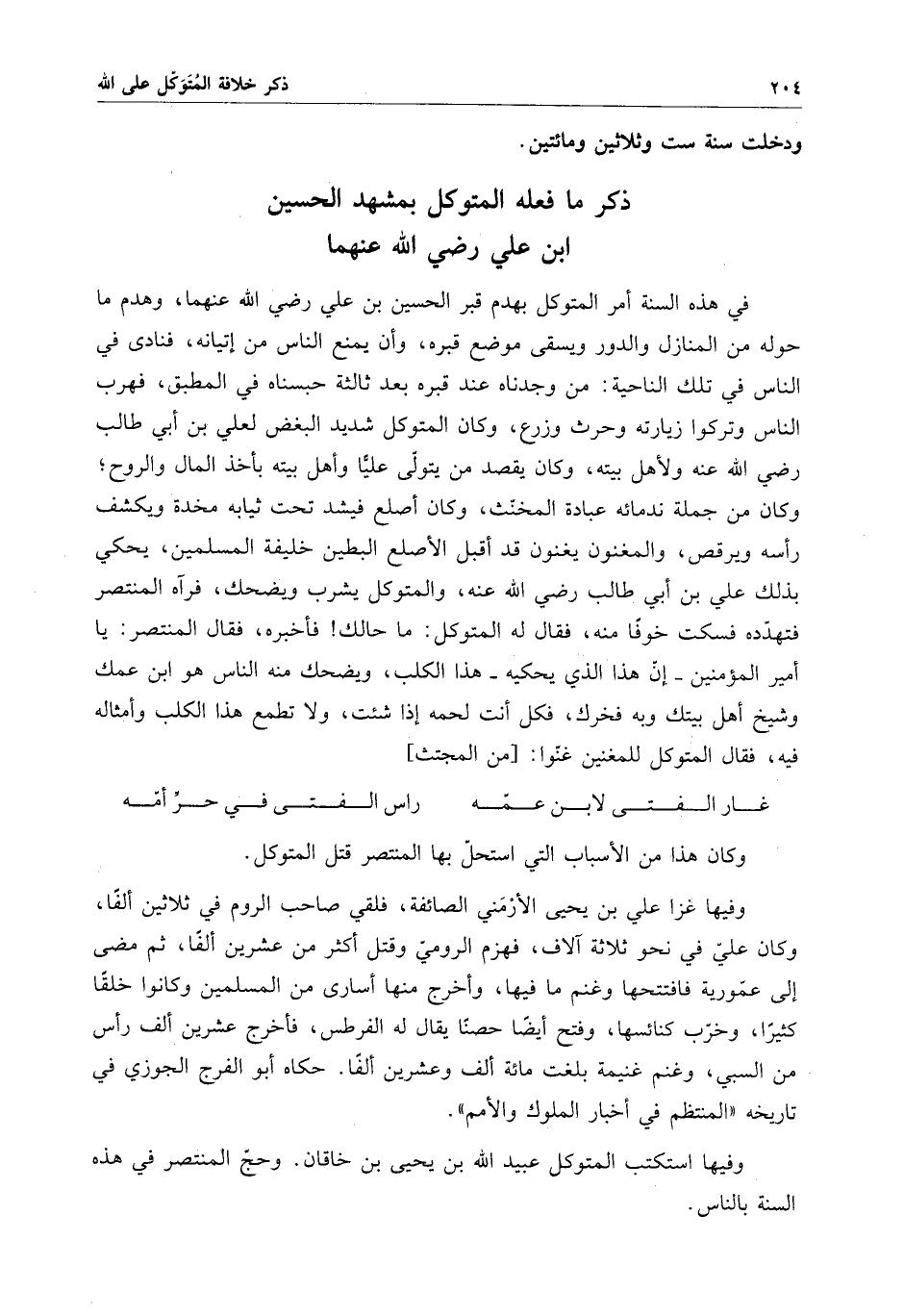 في هذه السنة أمر المتوكل بهدم قبر الحسين بن علي رضي الله عنهما ، وهدم ما حوله من المنازل والدور ويسقى موضع قبره ، وأن يمنع الناس من إتيانه ، فنادى في الناس في تلك الناحية : من وجدناه عند قبره بعد ثالثة حبسناه في المطبق ، فهرب الناس وتركوا زيارته وحرث وزرع ، وكان المتوكل شديد البغض لعلي بن أبي طالب رضي الله عنه - ولأهل بيته ، وكان يقصد من يتولى علياً وأهل بيته بأخذ المال والروح ، وكان من جملة ندمائه عبادة المخنث ، وكان أصلع فيشد تحت ثيابه مخدة ويكشف رأسه ويرقص ، والمغنون يغنون قد أقبل الأصلع البطين خليفة المسلمين ، يحكي بذلك علي بن أبي طالب رضي الله عنه ، والمتوكل يشرب ويضحك ، فرآه المنتصر فتهدده فسكت خوفاً منه ، فقال له المتوكل : ما حالك فأخبره ، فقال المنتصر : يا أمير المؤمنين - إن هذا الذي يحكيه - هذا الكلب - ويضحك منه الناس هو ابن عمك وشيخ أهل بيتك وبه فخرك ، فكل أنت لحمه إذا شئت ، ولا تطمع هذا الكلب وأمثاله فيه ، فقال المتوكل للمغنين غنوا :