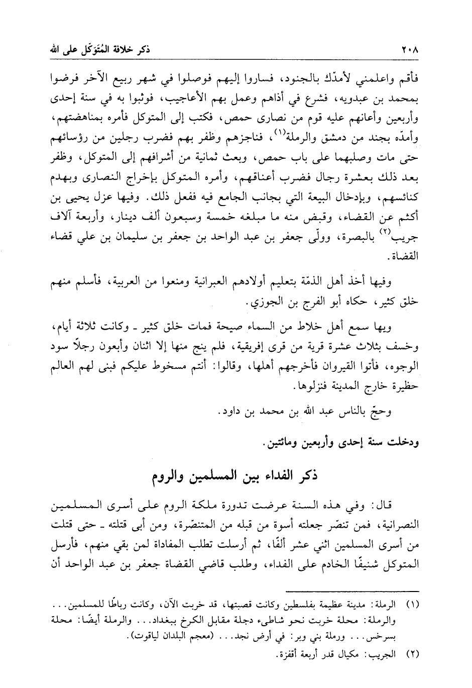 فأقم واعلمني لأمدك بالجنود ، فساروا إليهم فوصلوا في شهر ربيع الآخر فرضوا بمحمد بن عبدويه ، فشرع في أذاهم وعمل بهم الأعاجيب ، فوثبوا به في سنة إحدى وأربعين وأعانهم عليه قوم من نصارى حمص ، فكتب إلى المتوكل فأمره بمناهضتهم ، وأمده بجند من دمشق والرملة ، فناجزهم وظفر بهم فضرب رجلين من رؤسائهم حتى ماتا وصلبهما على باب حمص ، وبعث ثمانية من أشرافهم إلى المتوكل ، وظفر بعد ذلك بعشرة رجال فضرب أعناقهم ، وأمره المتوكل بإخراج النصارى وبهدم كنائسهم ، وبإدخال البيعة التي بجانب الجامع فيه ففعل ذلك . وفيها عزل يحيى بن أكثم عن القضاء ، وقبض منه ما مبلغه خمسة وسبعون ألف دينار ، وأربعة آلاف جريب بالبصرة ، وولى جعفر بن عبد الواحد بن جعفر بن سليمان بن علي قضاء القضاة .