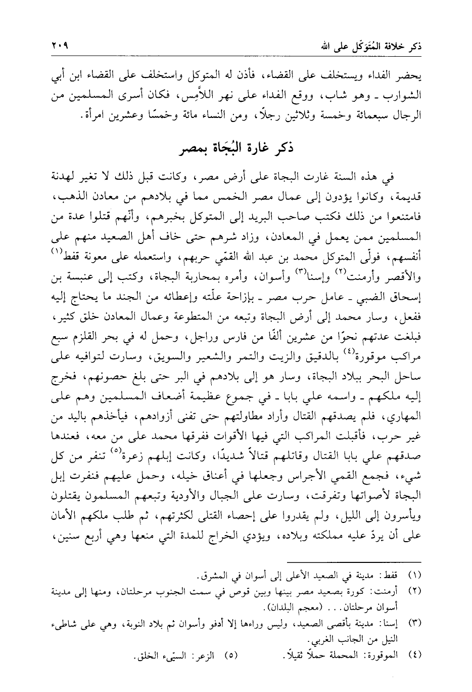في هذه السنة غارت البجاة على أرض مصر ، وكانت قبل ذلك لا تغير لهدنة قديمة ، وكانوا يؤدون إلى عمال مصر الخمس مما في بلادهم من معادن الذهب ، فامتنعوا من ذلك فكتب صاحب البريد إلى المتوكل بخبرهم ، وأنهم قتلوا عدة من المسلمين ممن يعمل في المعادن ، وزاد شرهم حتى خاف أهل الصعيد منهم على أنفسهم ، فولى المتوكل محمد بن عبد الله القمي حربهم ، واستعمله على معونة قفط والأقصر وأرمنت وإسنا وأسوان ، وأمره بمحاربة البجاة ، وكتب إلى عنبسة بن إسحاق الضبي - عامل حرب مصر - بإزاحة علته وإعطائه من الجند ما يحتاج إليه ففعل ، وسار محمد إلى أرض البجاة وتبعه من المتطوعة وعمال المعادن خلق كثير ، فبلغت عدتهم نحواً من عشرين ألفاً من فارس وراجل ، وحمل له في بحر القلزم سبع مراكب موقورة بالدقيق والزيت والتمر والشعير والسويق ، وسارت لتوافيه على ساحل البحر ببلاد البجاة ، وسار هو إلى بلادهم في البر حتى بلغ حصونهم ، فخرج إليه ملكهم - واسمه علي بابا - في جموع عظيمة أضعاف المسلمين وهم على المهاري ، فلم يصدقهم القتال وأراد مطاولتهم حتى تفنى أزوادهم ، فيأخذهم باليد من غير حرب ، فأقبلت المراكب التي فيها الأقوات ففرقها محمد - على من معه ، فعندها صدقهم علي بابا القتال وقاتلهم قتالاً شديداً ، وكانت إبلهم زعرة تنفر من كل شيء ، فجمع القمي الأجراس وجعلها في أعناق خيله ، وحمل عليهم فنفرت إبل البجاة لأصواتها وتفرقت ، وسارت على الجبال والأودية وتبعهم المسلمون يقتلون ويأسرون إلى الليل ، ولم يقدروا على إحصاء القتلى لكثرتهم ، ثم طلب ملكهم الأمان على أن يرد عليه مملكته وبلاده ، ويؤدي الخراج للمدة التي منعها وهي أربع سنين ،