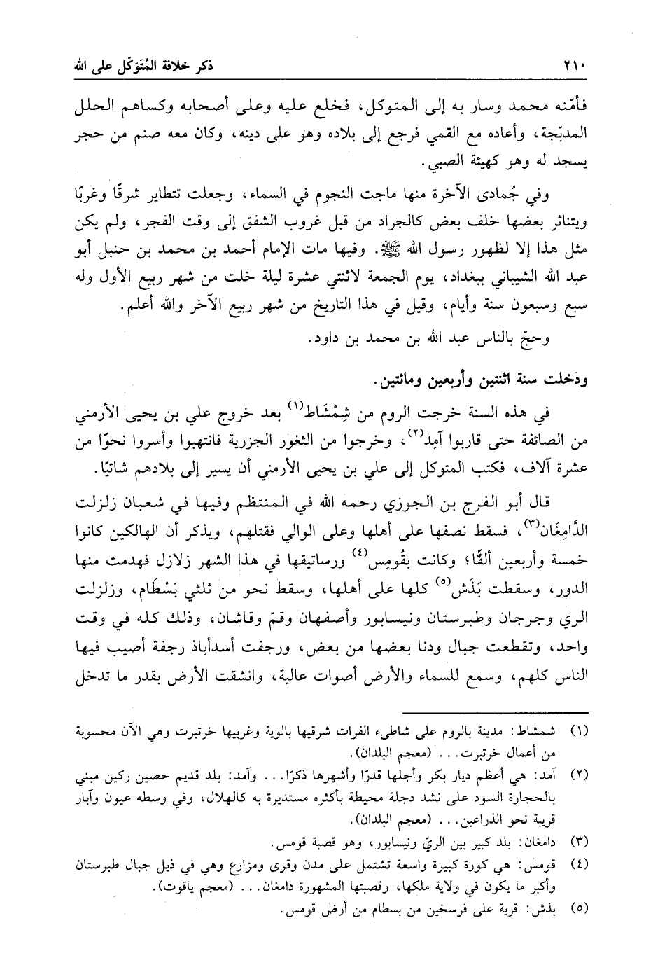 قال أبو الفرج بن الجوزي رحمه الله في المنتظم وفيها في شعبان زلزلت الدامغان ، فسقط نصفها على أهلها وعلى الوالي فقتلهم ، ويذكر أن الهالكين كانوا خمسة وأربعين ألفاً ، وكانت بقومس ورساتيقها في هذا الشهر زلازل فهدمت منها الدور ، وسقطت بذش كلها على أهلها ، وسقط نحو من ثلثي بسطام ، وزلزلت الري وجرجان وطبرستان ونيسابور وأصفهان وقم وقاشان ، وذلك كله في وقت واحد ، وتقطعت جبال ودنا بعضها من بعض ، ورجفت أسدأباذ رجفة أصيب فيها الناس كلهم ، وسمع للسماء والأرض أصوات عالية ، وانشقت الأرض بقدر ما تدخل