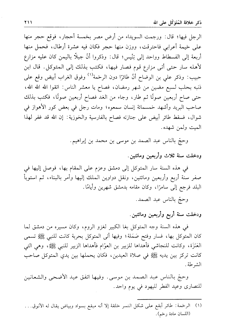 الرجل فيها ، قال : ورجمت السويداء من أرض مصر بخمسة أحجار ، فوقع حجر منها على خيمة أعرابي فاحترقت ، ووزن منها حجر فكان فيه عشرة أرطال ، فحمل منها أربعة إلى الفسطاط وواحد إلى تنيس ، قال : وذكروا أن جبلاً باليمن كان عليه مزارع لأهله سار حتى أتى مزارع قوم فصار فيها ، فكتب بذلك إلى المتوكل . قال ابن حبيب : وذكر علي بن الوضاح أن طائراً دون الرخمة وفوق الغراب أبيض وقع على ذنبه بحلب لسبع مضين من شهر رمضان ، فصاح يا معشر الناس : اتقوا الله الله الله ، حتى صاح أربعين صوتاً ثم طار ، وجاء من الغد فصاح أربعين صوتاً ، فكتب بذلك صاحب البريد وأشهد خمسمائة إنسان سمعوه ، ومات رجل في بعض كور الأهواز في شوال ، فسقط طائر أبيض على جنازته فصاح بالفارسية والخوزية : إن الله قد غفر لهذا الميت ولمن شهده .